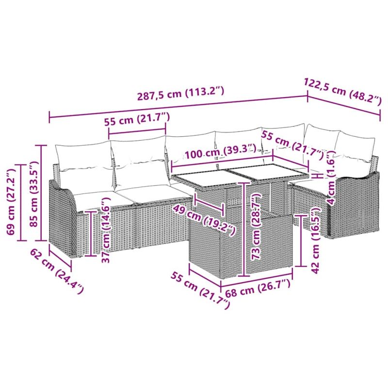 Този комплект дивани за открито за седем души носи модерен и елегантен вид на градините и терасите. Изработен от полиратан, той изглежда добре, а модулният дизайн позволява пренареждане според нуждите на пространството. Устойчиви материали: От полиратан, известен с устойчивостта си на UV лъчи и вода, комплектът издържа на външни условия и запазва яркия си вид. Включени компоненти: Комплектът включва 1 ъглово място, 3 централни места, 2 дивана с удобни повърхности и маса от закалено стъкло, предлагаща достатъчно място за събирания. Модулна функционалност: Модулният дизайн позволява различни конфигурации за различни пространства или поводи, улеснявайки максималната полезност и естетиката. Монтажът е лесен, нужни са само двама с отвертка. Разнообразно използване: Проектиран за открито, комплектът е подходящ за социални събирания, почивки или семейни вечери. Грижа и поддръжка: За по-дълъг живот на комплекта е добре да се използват защитни покрития, да се забърсват замърсяванията с влажна кърпа и да се прибират възглавниците при лошо време.