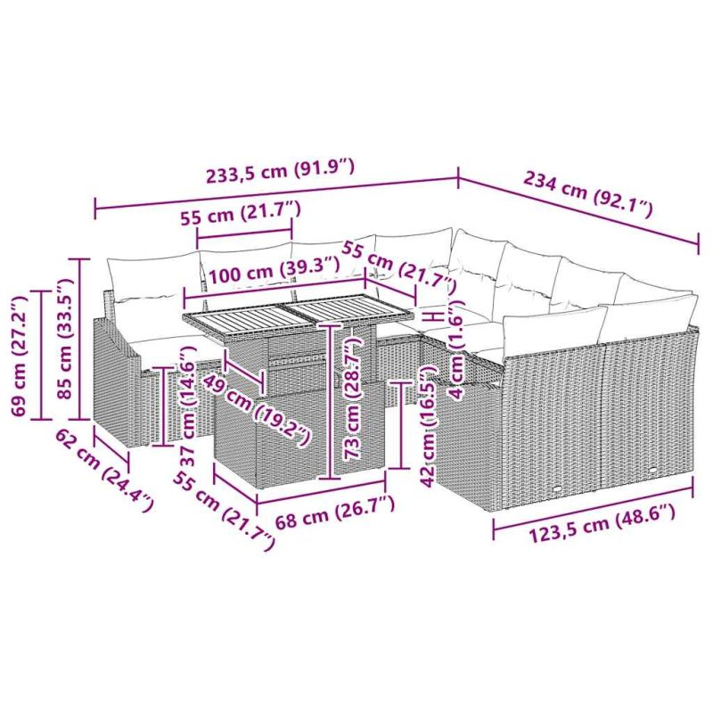 Повдигни визията на откритото си пространство с градинския комплект от полиратан, изключителна комбинация от стил и практичност за твоята градина или тераса. Този модерен комплект за хранене предлага чисти линии и минимално украшение, създавайки елегантен силует, който допълва простота на съвременния дизайн. Изработен с внимание, той въплъщава чувство за sophistication и осигурява комфорт по време на събиранията ти. Независимо дали за изискани бранчове или жизнени градински партита, този комплект предоставя приветлива обстановка за всяко социално събитие. Премиум материали: Изработен от здрав стоманен корпус с прахово покритие, полиратан и масивна акациева дървесина, този комплект за хранене осигурява дълготрайност и устойчивост на UV лъчи и време. Висококачествените материали предлагат хармонична комбинация от здравина и елегантност, правейки го идеален за открито ползване. Функционалност на съхранение: Внимателно проектиран с интегрирани места за съхранение в подлакътниците, ъгловите и централните седалки, предлагайки практично решение за организиране на възглавници и други основни неща. Тази функция добавя удобство, правейки го идеален за подредени открити пространства. Модулна многофункционалност: Модулните компоненти на комплекта за хранене позволяват разнообразни конфигурации. Лесно променяй подредбата в зависимост от нуждите, независимо дали става дума за уютна вечеря или голямо събиране, като предоставя гъвкавост и обогатява преживяването. Квадратни подлакътници: С геометрични, прави ръбове, изработени от полиратан, които предлагат практична опора и естетическа стойност. Този внимателен дизайн допринася за общия комфорт и стил, поканвайки те да се отпуснеш и взаимодействаш. Указания за поддръжка: Защити комплекта с водонепромокаемо покривало и избърсвай повърхностите от акациева дървесина с влажна кърпа, за да поддържаш красотата му. Следвай тези лесни стъпки, за да поддържаш градинския си комплект блестящ и готов за употреба.
