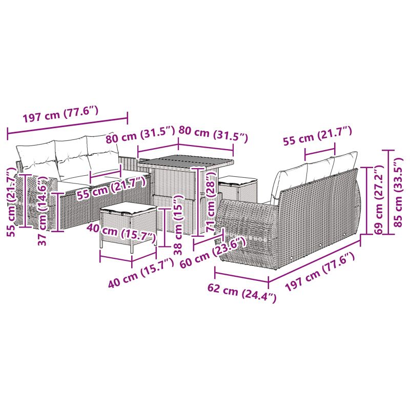 Този градински диванен комплект преосмисля откритата релаксация с модерен и модулен дизайн. Изработен с внимание, той има изчистени линии и минимални детайли, подходящи за градински или терасни пространства. Перфектен е за любителите на открито, които ценят както стил, така и практичност в мебелите си. Осигурява приятно място за почивка и социализиране. Насладете се на времето прекарано навън, докато внушителният стил на мебелите лесно се вписва в обстановката. Модулна структура Създаден за разнообразни конфигурации, този комплект може да се подрежда по различен начин, за да отговори на нуждите ви за отдих на открито. Независимо дали планирате парти или просто се наслаждавате на спокойствие, модулното разположение лесно се настройва, предоставяйки комфорт. Полиратан и акациево дърво Здравата конструкция от полиратан и масивно акациево дърво предлага дълготрайна устойчивост. Комбинацията осигурява елегантност и естествена красота, която допълва всяко открито пространство. Компоненти и удобства Всеки елемент идва с завършени облегалки и странични подпорти, което дава както стил, така и комфорт. Възглавниците са със цип за лесно сваляне и почистване, допълвайки удобството на изживяването. Устойчивост на елементите Благодарение на устойчивостта на UV лъчи и дъжд, този диван комплект запазва вида и целостта си с времето. Инвестицията ви е защитена от суровите атмосферни условия. Лесно съхранение Умният дизайн включва скрити отделения в пейките или столовете, идеални за организиране на възглавници и важни неща, спестявайки място и поддържайки ред.