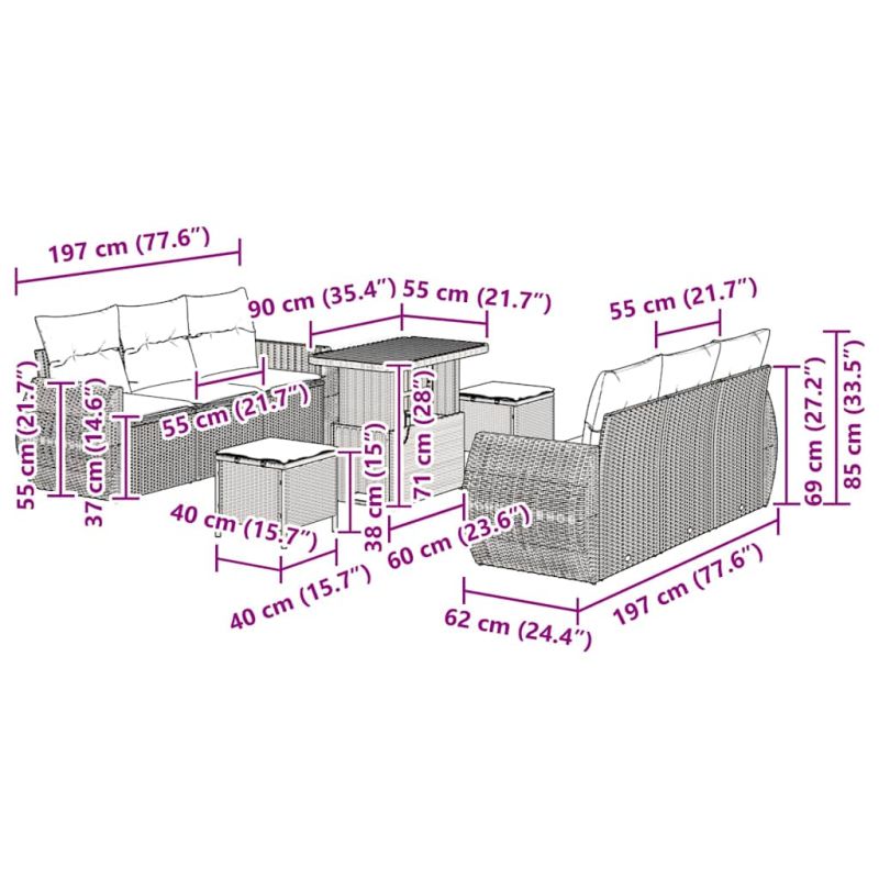 Този градински диванен комплект преосмисля откритата релаксация с модерен и модулен дизайн. Изработен с внимание, той има изчистени линии и минимални детайли, подходящи за градински или терасни пространства. Перфектен е за любителите на открито, които ценят както стил, така и практичност в мебелите си. Осигурява приятно място за почивка и социализиране. Насладете се на времето прекарано навън, докато внушителният стил на мебелите лесно се вписва в обстановката. Модулна структура Създаден за разнообразни конфигурации, този комплект може да се подрежда по различен начин, за да отговори на нуждите ви за отдих на открито. Независимо дали планирате парти или просто се наслаждавате на спокойствие, модулното разположение лесно се настройва, предоставяйки комфорт. Полиратан и акациево дърво Здравата конструкция от полиратан и масивно акациево дърво предлага дълготрайна устойчивост. Комбинацията осигурява елегантност и естествена красота, която допълва всяко открито пространство. Компоненти и удобства Всеки елемент идва с завършени облегалки и странични подпорти, което дава както стил, така и комфорт. Възглавниците са със цип за лесно сваляне и почистване, допълвайки удобството на изживяването. Устойчивост на елементите Благодарение на устойчивостта на UV лъчи и дъжд, този диван комплект запазва вида и целостта си с времето. Инвестицията ви е защитена от суровите атмосферни условия. Лесно съхранение Умният дизайн включва скрити отделения в пейките или столовете, идеални за организиране на възглавници и важни неща, спестявайки място и поддържайки ред.