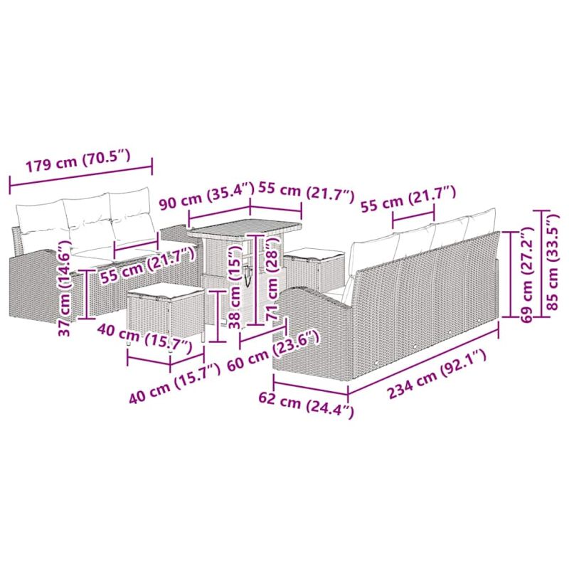 Градински Софа Комплект с възглавница 10 pcs Сив Полиратан