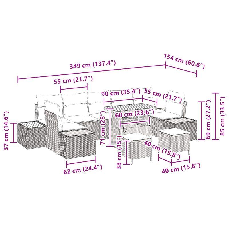 Градински Софа Комплект с възглавница 10 pcs Черно Полиратан