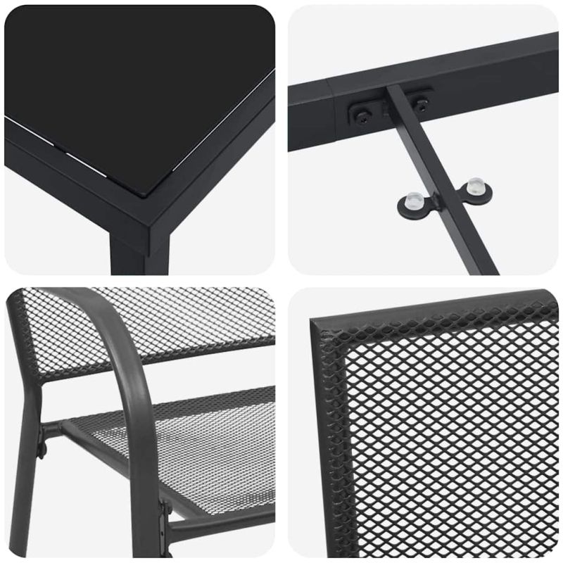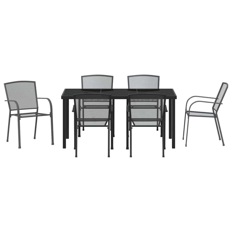 Този Съвременен комплект за трапезария в градината е идеалното допълнение към всяко открито пространство, предлагащо перфектна комбинация от модерен естетичен вид и практичност. С гладко антрацитово покритие, което хармонира с ярката зеленина на градини и тераси, този комплект приканва гостите да се насладят на хранене на открито с комфорт и стил. Проектиран за тези, които ценят съвременния дизайн, комплектът включва здрава маса и ергономично проектирани столове, готови да посрещнат събирания от интимни закуски до големи семейни вечери. Гладката маса от закалено стъкло гарантира, че ястията изглеждат толкова великолепно, колкото средата, правейки храненето под небето приятно преживяване. Премиум материали: Изграден от прахово боядисана стомана, комплектът за трапезария в градината е проектиран да предлага дълготрайна издръжливост. Със способности за устойчива на ултравиолетови лъчи, тази здрава структура е изградена да издържа на откритите елементи, докато запазва своя шикозен вид. Повърхността от закалено стъкло добавя нотка елегантност, предоставяйки надеждна и атрактивна трапезарна повърхност., Умно проектиране: Всеки стол е подредим, като се има предвид както комфорта, така и управлението на пространството. Тези столове идват с ергономични стоманени облегалки за допълнителна поддръжка, а подлакътниците са обработени за лесно отпускане. Солидната стоманена рамка обещава стабилност, осигурявайки, че можеш да се довериш на този комплект да проведе много запомнящи се трапезарни преживявания на открито., Устойчивост на времето: Прекарай повече време, наслаждавайки се на градината си, знаейки, че мебелите ти са оборудвани да издържат на най-суровите лъчи на лятото. Устойчивата на ултравиолетови лъчи стомана и праховото покритие защитават от избледняване и износване, така че можеш да се наслаждаваш на продукт, който изглежда чудесно не само през един сезон., Сложен стил: Благодарение на съвременния си дизайн, този комплект подобрява откритите пространства, внасяйки модерен нюанс, който повишава обстановката. Антрацитовата цветова схема гарантира, че се интегрира безпроблемно с различни декори, предлагайки универсалност без да жертва стила., Лесна поддръжка: Поддържането на комплекта за трапезария в градината в безупречно състояние е лесно. Покривай мебелите, когато не се използват или по време на лошо време за оптимална поддръжка. Никакви агресивни химикали не са нужни, просто забърсвай повърхностите по необходимост, за да поддържаш всичко блестящо. Максимално 110 кг на седалка.
