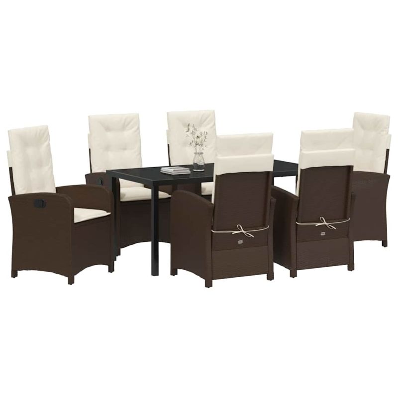 Този модерен комплект за хранене обединява стил и практичност. Проектиран да бъде привлекателно допълнение за всяко открито пространство, като градини и тераси. Със sleek линии и елегантен силует, той е за тези, които търсят стилно и удобно място за хранене на открито. Съчетанието от материали придава визуален чар и дълготрайност, правейки го чудесен избор за всеки, който иска да подобри преживяването си навън. Комбинирайки традиционното майсторство с модерния дизайн, този комплект предоставя удобно място за хранене и социализиране – идеален фон за семейни събирания или спокойни вечери под звездите. Елегантен полиратан С насладаEnjoy stylish полиратан с уникалната му плетена текстура. Този материал е устойчив на атмосферни условия, което прави комплекта подходящ за целогодишна употреба. Със sleek дизайна, той е идеален за любителите на съвременния стил и предлага удобство при релаксация. Повърхност от закалено стъкло Маса с издръжлива повърхност от закалено стъкло, която добавя към красотата и е супер практична. Не се е лесно надрасква от прибори и съдове, така че комплектът остава красив и лесен за почистване. Комфортен дизайн Удобни облегалки и подлакътници от полиратан, предлагат добра опора. Меките седалки осигуряват приятно изживяване при хранене, идеални за дълги разговори. Здрава стоманена рамка Здравата стоманена конструкция е силна и стабилна. Тя издържа на натоварване и лошо време, което я прави много надеждна. Ръчно регулиране Можете лесно да регулирате облегалките в различни позиции според предпочитанията, било то наклон към назад или изправено сядане. Тази гъвкавост я прави подходяща за всякакви активности. Максимално 110 кг на седалка. Съобразете се с риска от открит огън и други източници на силна топлина в близост до продукта.