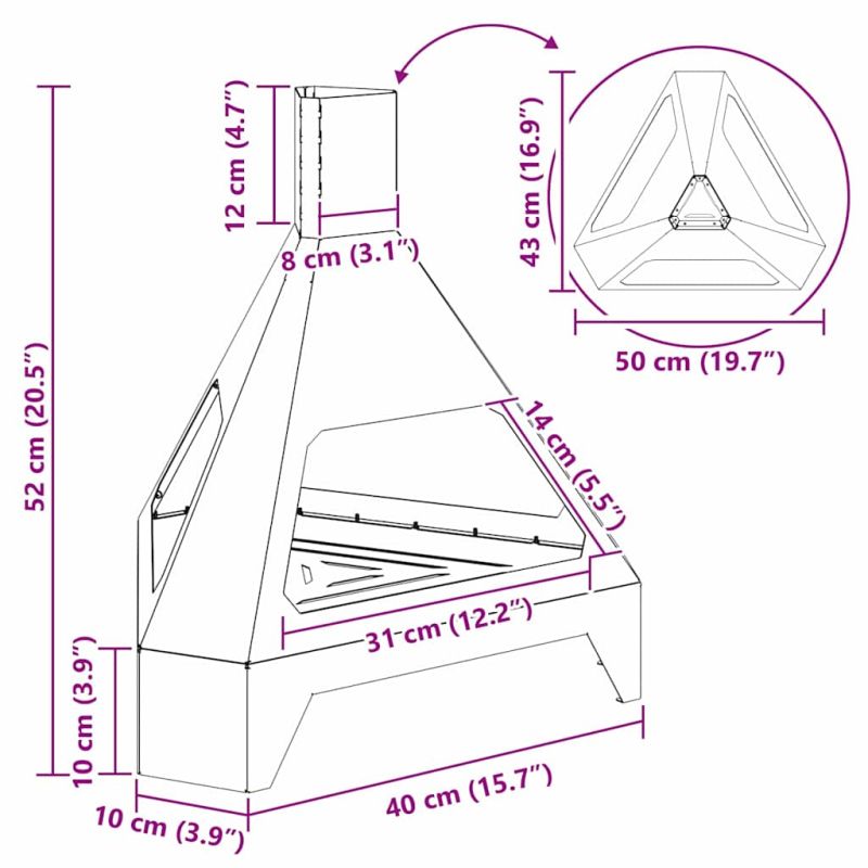 Тази триъгълна печка на дърва прави откритите места като балконите много уютни, превръщайки ги в комфортни кътчета, където можеш да се насладиш на топлината в хладните вечери. Модерният дизайн съчетава стил и функция, помагайки ти да създадеш спомени на открито, докато се събирате около пукащия огън. Здрав дизайн: Здраво строителство, което издържа, давайки надеждно топлоизлъчване за твоите събирания. Устойчив на топлина: Изработена с материали, които безпроблемно понасят високи температури, позволявайки ти да се наслаждаваш на топлината без притеснения. UV-устойчиви материали: Проектирана да устоява на слънцето, запазвайки външния вид. Устойчив на ръжда: Остава функционална и стилна и при дъжд — идеална за навън! Компактни размери: С размери 50 см дължина, 43 см ширина и 52 см височина, е точният вариант за по-малки пространства, без да жертва ефективността. ВНИМАНИЕ: Не използвайте спирт или бензин за запалване или припалване!