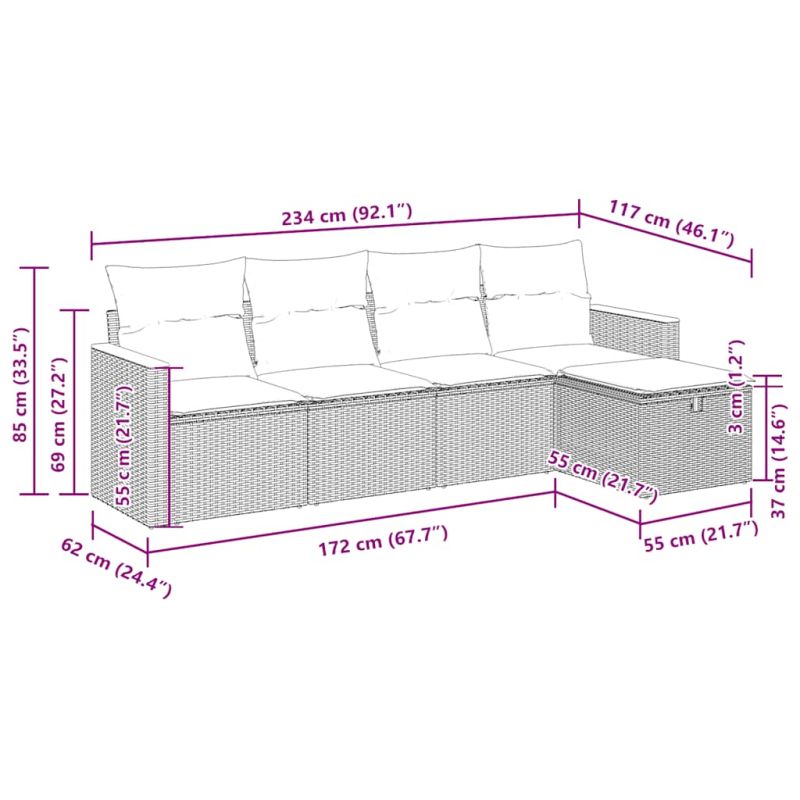 Този градински диван е идеалното допълнение към вашия заден двор, тераса или вътрешен двор, осигурявайки удобно и привлекателно пространство за разговори със семейството и приятелите или просто за почивка и забавление на открито. Издръжлив материал: PE ратан, известен също като полиратан, е здрав синтетичен материал с малко необходима поддръжка, който прилича на естествен ратан. Той е лек, лесен за почистване и често се използва за външни мебели поради своята издръжливост и устойчивост на атмосферни влияния.Функция за съхранение с водоустойчива чанта: Всяка градинска седалка разполага с място за съхранение под седалката, допълнено с водоустойчива чанта за съхранение на възглавници, играчки и други предмети. Вътрешната чанта има горен капак и може да бъде здраво закрепена към седалката със закопчалки за допълнителна стабилност.Универсална табуретка за крака: Табуретката е универсална и служи като удобна поставка за крака, когато се излежавате на дивана или като допълнителна седалка във вашата градина.Калъф, който може да се сваля и може да се пере: Тези възглавници за седалки имат подвижни калъфи за лесно пране и поддръжка.Здрава и стабилна рамка: Прахово боядисаната стоманена рамка е здрава, стабилна, издръжлива и устойчива на корозия и неблагоприятни атмосферни условия, което гарантира дълготрайна експлоатация. Добре е да се знае:За да сте сигурни, че вашите външни мебели ще останат красиви, ви препоръчваме да ги защитите с водоустойчиво покривало.