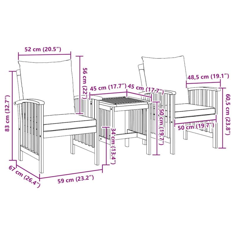 Градински Софа Комплект 3 pcs Кафяво Акациево дърво масив