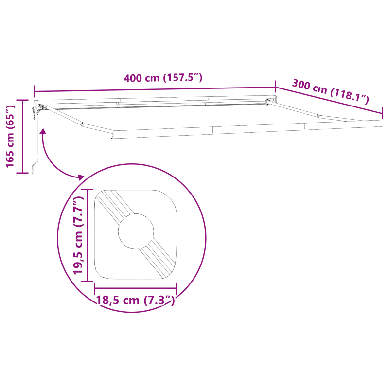 Тази сгъваема завеса за слънце е перфектна комбинация от стил и функция. Идеално решение за затеняване на твоите външни места. С чистите си линии и минималистичния си вид, е супер за балкони и патета, правейки ги уютни места за събиране. Устойчива е на времето, а здравият ръчен механизъм значи, че можеш лесно да я изтегляш или прибереш, когато ти трябва. Перфектна е за неофициални срещи или тихо време навън и определено помага за хубавото настроение с вградените LED светлини. Устойчиви на времето материали Изработена от плат, който е UV-устойчив и водоотблъскващ, тази завеса е достатъчно здрава, за да понесе всякакво време. Няма да избледнее на слънце, така че ще изглежда добре дълго време. Вградени LED светлини С гъвкави LED ленти, завесата осветява твоето външно пространство, придавайки му страхотна атмосфера след тъмно. Перфектна е за relax вечер или забавление с приятели. Ръчен механизъм за работа Лесно се регулира; просто я изтегляш или прибираш както ти трябва. Никакви сложни устройства - всичко е просто и удобно. Модерен естетически вид Изчистеният, съвременен дизайн е за простота и практичност. Прахово боядисаното покритие добавя стил, а също така предпазва от времето. Лесна грижа и поддръжка Да я поддържаш чиста е лесно - просто я избърсваш с влажна кърпа и избягваш агресивни химикали. Нанасянето на водоустойчив спрей преди силен дъжд помага да издържи още по-дълго. Опасност! Силен отскок при отваряне. НЕ сваляйте това въже, освен ако не сте приключили с всички стъпки на сглобяване. Всички болтове трябва да са затегнати и елементът да е прикрепен към стената! Предупреждение! Внимавайте, когато разхлабвате рамената, защото те са под напрежение! Внезапното освобождаване на рамо на сгъваема тента може да причини нараняване. Внимание: Инструкциите за ползване трябва да бъдат прочетени преди употребата на продукта. Предупреждение: Работата в студени условия може да повреди продукта. Външна употреба в сгради и други строителни обекти.