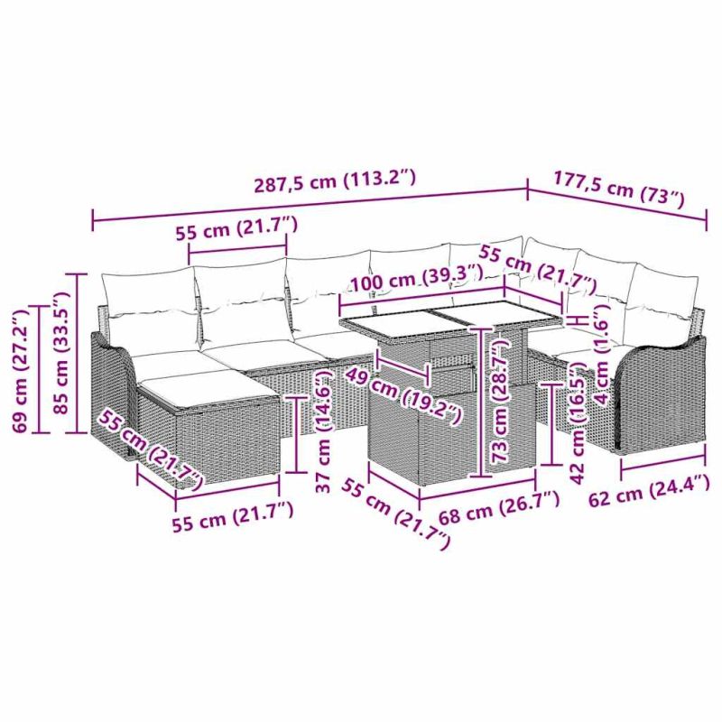 Градински Софа Комплект с възглавница 9 pcs Черно Полиратан