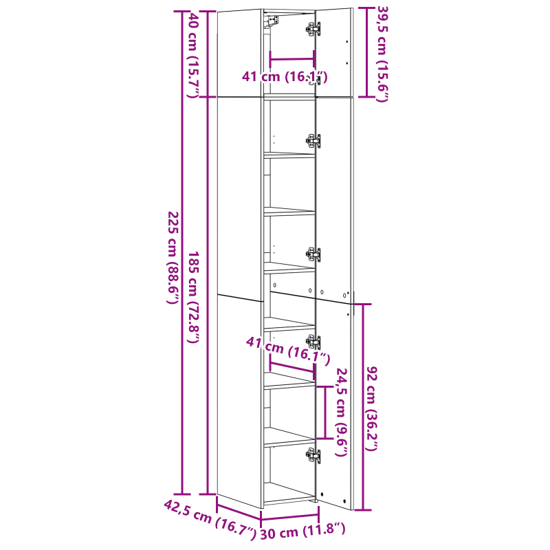 Този стилен шкаф от инженерна дървесина съчетава модерен дизайн с отлична функционалност - идеален за организиране на дома, без да жертва естетиката. С елегантни линии и минимално декориране, шкафът предлага много място за съхранение с компактни размери от 30 x 42.5 x 225 см. Изработен е от инженерна дървесина, което го прави здрав и подходящ за всякакви среди. Материал от инженерна дървесина: Този шкаф е направен от инженерна дървесина, което осигурява здравина и гладка повърхност с модерен вид. Структурата му е стабилна, независимо от условията. Обширен капацитет за съхранение: С комбинирането на един стенен и два високи шкафа, шкафът максимизира пространството, изглеждайки елегантно. Без значение къде го ползвате, той предлага лесен достъп до всичко. Стилен модерен дизайн: С чисти линии и минималистичен вид, шкафът лесно се вписва в съвременни интериори. Неговата елегантност е перфектна за домове, ценящи простотата и функционалността. Всестранна вътрешна употреба: Направен за закрито, този шкаф е идеален за много места - от съхранение на книги в кабинета до порцелан в трапезарията, лесно се адаптира към всякакви нужди. Сглобяване и поддръжка: Изключително лесен за сглобяване, шкафът си иска двама души и отвертка, а инструкциите са ясни. Поддръжката е без усилие, просто го избършете с суха кърпа, за да бъде като нов.