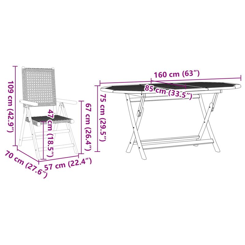 Този сгъваем комплект за градинска маса и столове е прекрасно допълнение за всяка градина или тераса, с модерен стил и свеж вид. Създаден е за открито, този комплект осигурява прекрасно място за събирания, независимо дали са малки или големи, и е супер гъвкав за семейни вечери и летни купони. С богатите си кафяви тонове, той се вписва прекрасно в природата и е не само стилен, но и адаптивен. Материали: Сгъваемият комплект за градинска маса и столове е изработен от масивна акациева дървесина, което осигурява стабилност и дълготрайност. Натуралният завършек е с прекрасен омаслен вид, който подобрява яркостта на цвета и предпазва от влага. Включени компоненти: Комплектът е проектиран с мисъл за удобството на потребителя, с крака и подлакътници от масивна акациева дървесина, а полиратанната облегалка и седалка предлагат комфорт и стил. Включва и сваляемо възглавничка за седалка с цип, което улеснява почистването. Функции / Функционалност / Дизайн: Сгъваемият механизъм е практичен и позволява компактно съхранение, идеално за места, където пространството е ограничено. Лесно се пренася, когато не е в употреба, а съвременният му стил го прави подходящ за различни интериори. Препоръчителни употреби: Комплектът е идеален за градини, тераси или веранди, осигурявайки прекрасно място за хранене на открито. Модерният му стил се комбинира отлично със съвременни декорации и предоставя уютна атмосфера на вашите гости. Грижа и поддръжка: За да запазите привлекателността му за дълго време, покривайте комплекта, когато не го използвате и чистете повърхностите с влажна кърпа, за да отстраните прах и замърсявания. Тези прости стъпки ще запазят красотата и функционалността му за години напред.