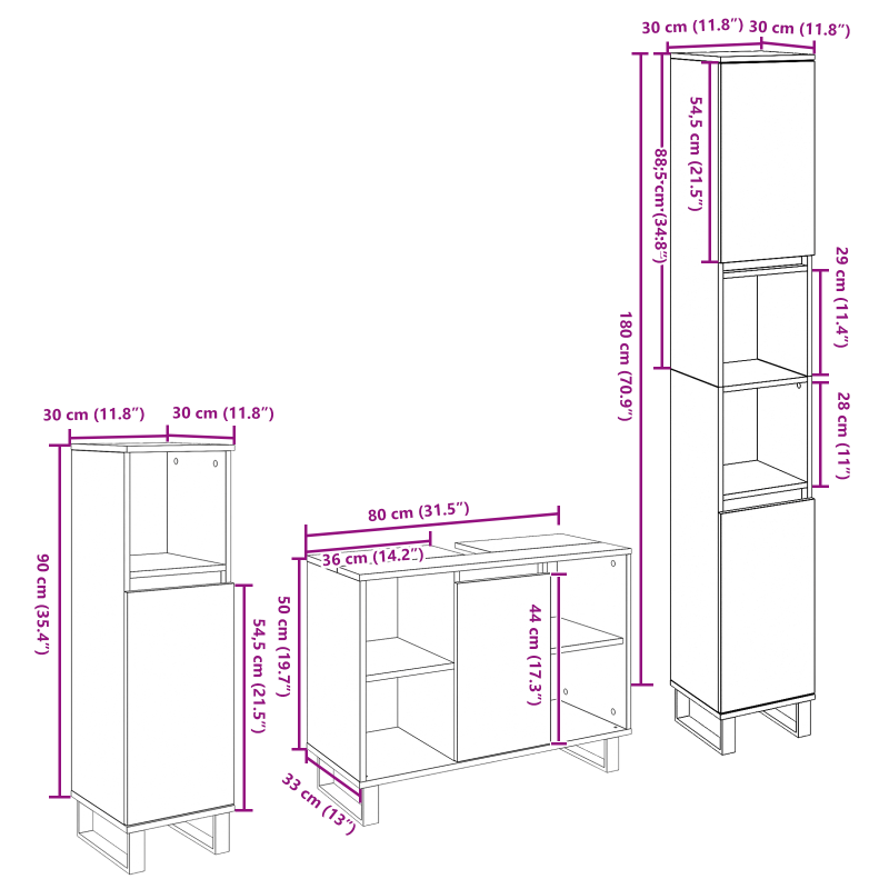 Този комплект за баня съчетава функционалност и естетика—идеален за съвременни домове. Линейният дизайн и правоъгълната форма му придават елегантен вид, който пасва на всяка баня. Проектиран е така, че да максимизира съхранението, осигурявайки удобен достъп до всичко. Ако цениш и стил, и практичност, този комплект предлага много опции за съхранение с елегантен и прост дизайн. С него, банята ти ще стане стилно и добре подредено място. Качествени материали Изработен от инженерна дървесина, комплектът е дълготраен и устойчив на износване. Материалът осигурява равномерен завършек, който увеличава атрактивността му. Функционални компоненти С стелажи и симпатични врати с панти, всяка част от шкафа спомага за максималното оползотворяване на вертикалното пространство, помагайки ти да поддържаш ред. Модерна естетика С ясни линии и минималистичен завършек, комплектът отлично допълва съвременни интериори. Простият му дизайн позволява безпроблемно сливане с банята. Предназначени употреби Проектиран за вътрешна употреба, комплектът е за тези, които искат елегантно и организирано пространство в банята. Перфектен за съхранение на козметични продукти или кошници. Лесна поддръжка Поддържай го свеж с влажна кърпа—така мебелите ще останат в отлично състояние години наред.