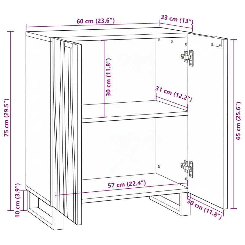 Този рустикален дървен шкаф е идеалният функционален и стилен елемент, който подобрява всяко пространство в трапезария или всекидневна. Със съсредоточеност върху естествената, груба красота, той съчетава масивно мангово дърво и инжинирована дърво, предоставяйки и естетика, и удобство. Стилният му дизайн е допълнен от плавни линии и правоъгълна форма, приложими в всяка интериорна среда, идеалният избор за тези, които търсят топлина и функционалност. Състав на материала: Шкафът е направен от качествено масивно мангово дърво, което дава естествена топлина и е устойчиво на ежедневното износване. Компонентите от инжинирована дървесина добавят допълнителна стабилност, а уникалната текстура и цветовите вариации правят всяко парче уникално. Функционални компоненти: С включени дръжки за пръсти, шкафът е стилен и лесен за ползване, а рафтовете предлагат много опции за съхранение. Всички части са умело внедрени, за да направят използването му удобно, но същевременно стилово атрактивно. Просторно съхранение: Проектиран с достатъчно пространство, шкафът предлага множество отделения, идеални за организиране на принадлежности, книги или декор. Практичният му дизайн позволява лесен достъп и подредба на съхраняваните неща. Стилна многофункционалност: Идеален е за трапезария или всекидневна, добавяйки рустикален чар към много интериорни теми. Здравият и прост дизайн вписва се прекрасно както в неформални, така и в по-официални обстановки. Грижа и поддръжка: Лесен за поддръжка, просто забърсвайте с влажна кърпа, за да запазите повърхността чиста и ярка, осигурявайки дълготрайност и рустикален вид във времето.