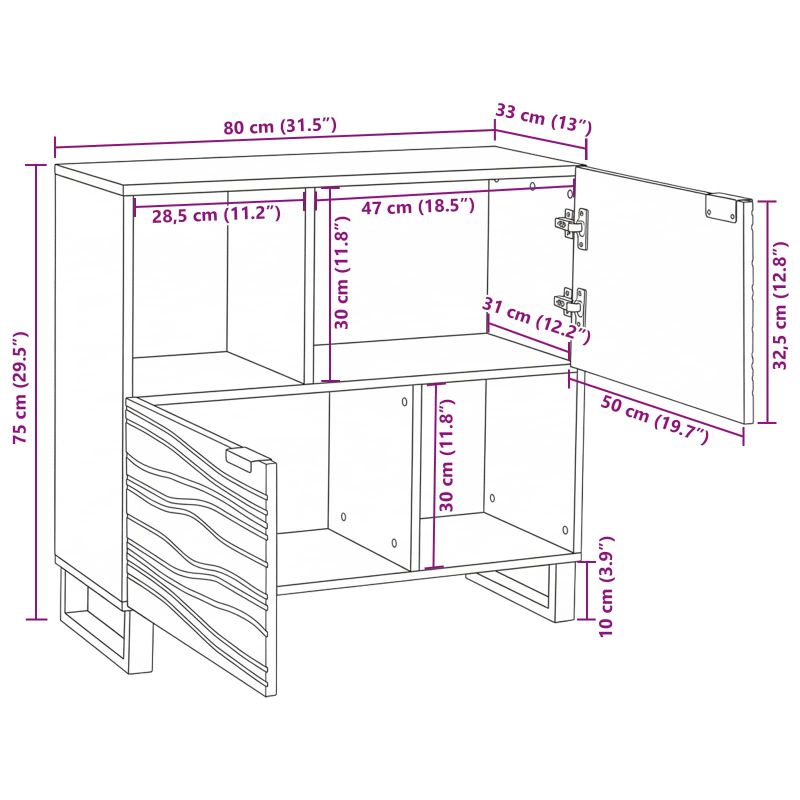 Този правоъгълен шкаф има страхотен рустикален чар, който се вписва добре в традиционни и модерни стилове. Текстурираното покритие и уникалният вълновиден модел му придават характер, добавяйки стил към всяка трапезария или всекидневна. Проектиран е да се слее с обстановката, докато предлага практично и стилно решение за съхранение. Материали: Шкафът е основно от масивна мангово дърво, известно със своята издръжливост и хубави цветове. Има и малко инженерна дървесина за допълнителна стабилност и устойчивост на износване. Тази комбинация прави шкафа дълготраен и му придава приятен вид, който идеално пасва на всеки дом. Повърхност от мангово дърво: С красивата си покритие от масивно мангово дърво, този шкаф наистина изпъква, както по визия, така и по функционалност. Този плътен материал е достатъчно здрав, за да издържи на ежедневна употреба, оставайки със свойствата на рустикалния стил. Структура с железни крака: С черни железни крака, шкафът е наистина стабилен. Те му дават опора, за да не се клати. Вписват се отлично в рустикалния дизайн, добавяйки към общата здравина. Функционален дизайн за съхранение: Благодарение на здравите си рафтове, шкафът предлага много пространство за съхранение. Вратите с панти позволяват лесен достъп до твоите вещи, а всичко остава сигурно. Перфектен е за съхранение на трапезни принадлежности, книги или декорации, толкова практичен, колкото и стилен. Грижа и поддръжка: Редовното прахосване с мека, суха кърпа запазва шкафа в отлично състояние. Просто следвай инструкциите за сглобяване с основни инструменти като отвертка и чук, за да го сглобиш лесно. Спазвай тези съвети за поддръжка, за да го запазиш красив и в отлично работно състояние.
