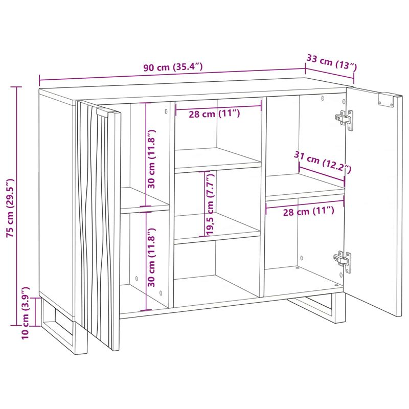 Погледни този страхотен правоъгълен шкаф – идеален е, ако искаш стил и практичност в хола или трапезарията. С рустик чар и вълнообразни акценти, той не само изглежда добре, но е и супер функционален за съхранение на твоите вещи. Здравата му конструкция предлага достатъчно място, което помага всичко да е под ръка и да изглежда подредено. Това е сериозно парче, което внася елегантност във всяка стая. Масивно мангово дърво: Този шкаф е изработен от масивно мангово дърво, което го прави здрав и стилен, идеален за натоварени домове. Висококачественият материал добавя естествено усещане и запазва рустик усет, чудесен за всяко пространство. Много места за съхранение: Шкафът предлага множество рафтове за лесно организиране. Със затворени рафтове зад врати на панти, всичко е само на една ръка разстояние и без разхвърляност. Перфектен за съдове, книги или малки неща, той е универсален за всичките ти нужди за съхранение. Рустик дизайн: Със своя рустик вид, шкафът придава уют и здравина на твоя дом. Правоъгълната форма се съчетава страхотно както с традиционен, така и с модерен стил, обогатявайки жилищното пространство. Лесно позициониране: С размери 90 x 33 x 75 см, този шкаф може да се постави красиво на всяка стена. Перфектен като акцент или допълнително място за съхранение, той съчетава практичност с икономия на пространство във всеки дом. Лесна поддръжка: Шкафът е супер лесен за поддръжка – просто го избърсвай с мека, суха кърпа, за да оставя свеж вид. Дизайнът му означава, че не се налага да правиш постоянно обширно почистване, което гарантира, че остава стилно парче за дълго време с минимални усилия.