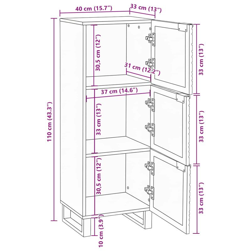 Това рустикално високо шкафче е стилна мебел за всяка всекидневна. С правоъгълната форма и красивия вълнообразен модел, съчетава много място за съхранение с класен вид, което го прави наистина забележимо в дома ти. Материали: Шкафчето е направено от здраво мангово дърво, известно със своята дълготрайност и красота. Солидната конструкция гарантира, че ще изглежда страхотно с времето. Включени компоненти: С ясни рафтове и врати с панти за лесен достъп до вещите ти, организирането е детска игра. Всеки рафт е проектиран да държи различни предмети без усилия, улеснявайки поддържането на ред. Характеристики / Функция / Дизайн: Шкафчето предлага много място за съхранение, което поддържа всичко подредено. Правоъгълната форма е универсална, идеуска в ежедневието, като предлага здраво и стилно пространство за декоративните ти предмети. Препоръчителни употреби: Това шкафче повишава функционалността на твоята всекидневна, служейки като централно място или фон за всякакви събития. Независимо дали каниш приятели или имаш спокойна нощ у дома, то винаги е удобно. Грижа и поддръжка: За да го запазиш в отлично състояние, просто следвай инструкциите за сглобяване и почиствай с мека, суха кърпа. Следвай указанията на производителя, за да го запазиш безопасно и дълготрайно.