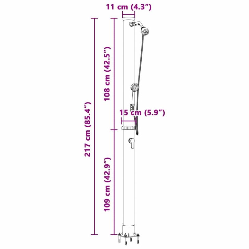 Този външен слънчев душ превръща градината ти в модерен оазис с елегантната си цилиндрична форма. Перфектно комбинира стил и практичност, създаден за тези, които ценят простотата и ефективността в откритите пространства. Наслади се на освежаващо измиване, захранвано от слънцето, топло е и е идеално за релаксация край басейна, а минималистичният му вид и функционален дизайн ще те зарадват. Висококачествени материали: Изработен от здрава PVC и алуминиеви материали, този душ е създаден да издържи дори при силно слънце. UV устойчивостта гарантира, че материалите ще останат в отлично състояние и душът ще изглежда добре и след време. Всичко включено: Душът идва с удобна въртяща се функция, което го прави много лесен за използване. Слънчевата система за отопление работи отлично, предоставяйки топли душове без нужда от електрически уреди. Умни функции: Проектиран за употреба на открито, този душ има функция за отопление, за да се радваш на топло измиване, дори когато навън е малко хладно. Въртящият се дизайн позволява да насочваш водата където е необходимо. Перфектни приложения: Идеален е за тераси и градини, този душ се вписва перфектно в откритото оформление. UV устойчивата му конструкция е чудесна за места край басейна или навсякъде, където има слънце, позволявайки ти да го използваш през цялото лято. Лесна поддръжка: Поддържането на душа в добро състояние е елементарно. Просто проверявай слънчевия панел редовно за оптимална работа, избърсвай го с влажна кърпа, а дренажната система поддържай чиста за дълготрайна употреба.