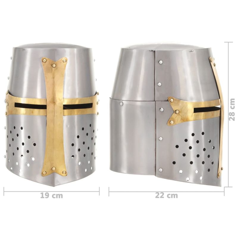 Тази антична каска, наричана още шлем Кръстоносец, е чудесна за ЛАРП (ролева игра на живо), косплей, партита на историческа тема, Хелоуин парти, театрални реквизити и исторически възстановки. Военният шлем е точна реплика на оригинален средновековен рицарски шлем кръстоносец. Изработен от стомана с дебелина 18 gauge, той съчетава античен стил и здрав материал в привличащ вниманието шлем, който идеално ще пасне на вашия рицарски тоалет. Тази каска, която можете да поставите на главата си, е с малки отвори за видимост и вентилация и предлага значително по-добра защита от обикновените каски. При това тя е с атрактивен дизайн.