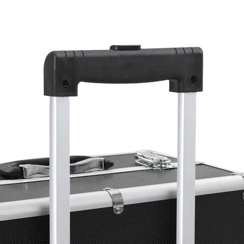 Нашият куфар за грим на колелца е идеалното решение за поддържане на козметиката ви добре подредена. Просто опаковайте всичко необходимо в този практичен куфар за грим и го вземете със себе си! Изработен от дърво, ABS листове и алуминий, този куфар за грим лесно ще съхранява козметиката ви и ще я поддържа в перфектно състояние. Този куфар за грим разполага с 4 нива и разтегаеми тави в горната част, осигуряващи достатъчно място за съхранение на вашите козметични средства и продукти за красота. Той разполага с 4 подвижни колелца, които улесняват преместването му и транспортирането му с вас, където и да отидете!