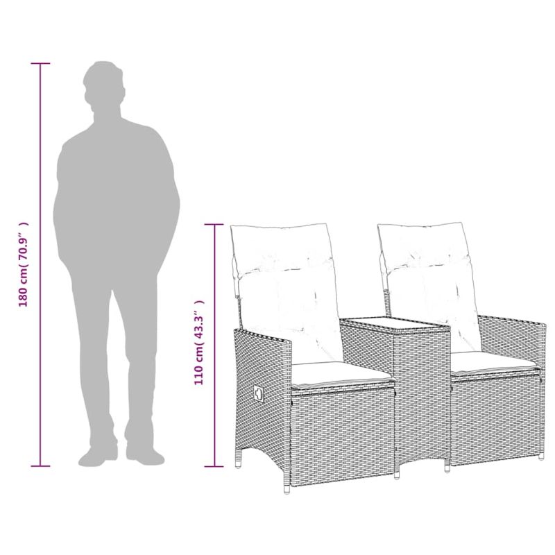 Отпуснете се и се насладете на открито в този удобен градински диван с възможност за накланяне! Издръжлив материал: PE ратанът, известен още като полиратан, е здрав, лесен за поддръжка синтетичен материал, който прилича на естествен ратан. Той е лек, лесен за почистване и често се използва за градински мебели поради своята издръжливост и устойчивост на атмосферни влияния.Удобна централна маса: Тази градинска мебел разполага с вградена централна маса, осигуряваща удобно място за съхранение на вашите най-важни вещи под ръка.Регулируема облегалка: Тази градинска седалка има дръжки. Можете да регулирате облегалката във всяка позиция, като издърпате дръжката, и бързо да я върнете в първоначалното ѝ положение.Комфортно седене: Тази градинска мебел, оборудвана с дебело подплатени възглавници, предлага комфортно седене.Свалящ се и перещ се калъф: Тези възглавници за седалки имат свалящи се калъфи за лесно пране и поддръжка. Полезно е да знаете:За да сте сигурни, че вашите градински мебели ще останат красиви, препоръчваме да ги защитите с водоустойчив калъф.