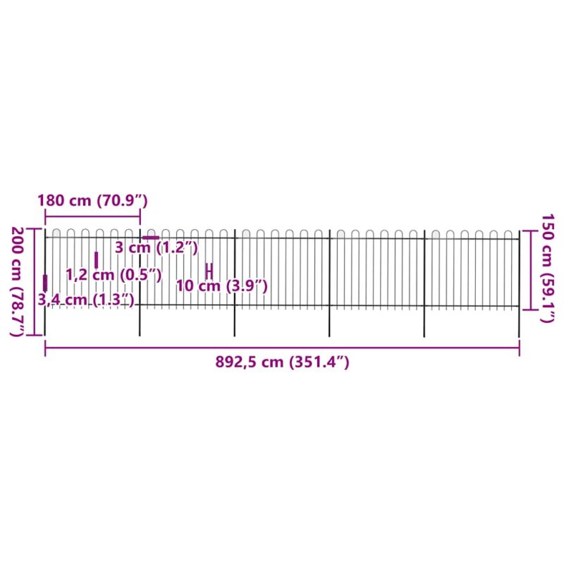 Създайте елегантна преграда около вашата градина, дом или алея с нашата градинска ограда! Нашата декоративна стоманена градинска ограда, състояща се от 5 градински панела и 6 стълба, има обща дължина от 8,5 метра. Тя ще формира здрава, сигурна и неизискваща поддръжка периметърна бариера за вашата градина, дом или бизнес имот. С вертикални колове с извити върхове и здрава хоризонтална скоба за подсилване на рамката, нашата градинска ограда ще осигури висока степен на сигурност. Изработена от прахово боядисана устойчива стомана, градинската ограда е много здрава, стабилна и издръжлива. Благодарение на включените монтажни материали, градинската ограда се сглобява лесно. Забележка: Можете да закупите повече комплекти, за да направите оградата толкова дълга, колкото желаете.