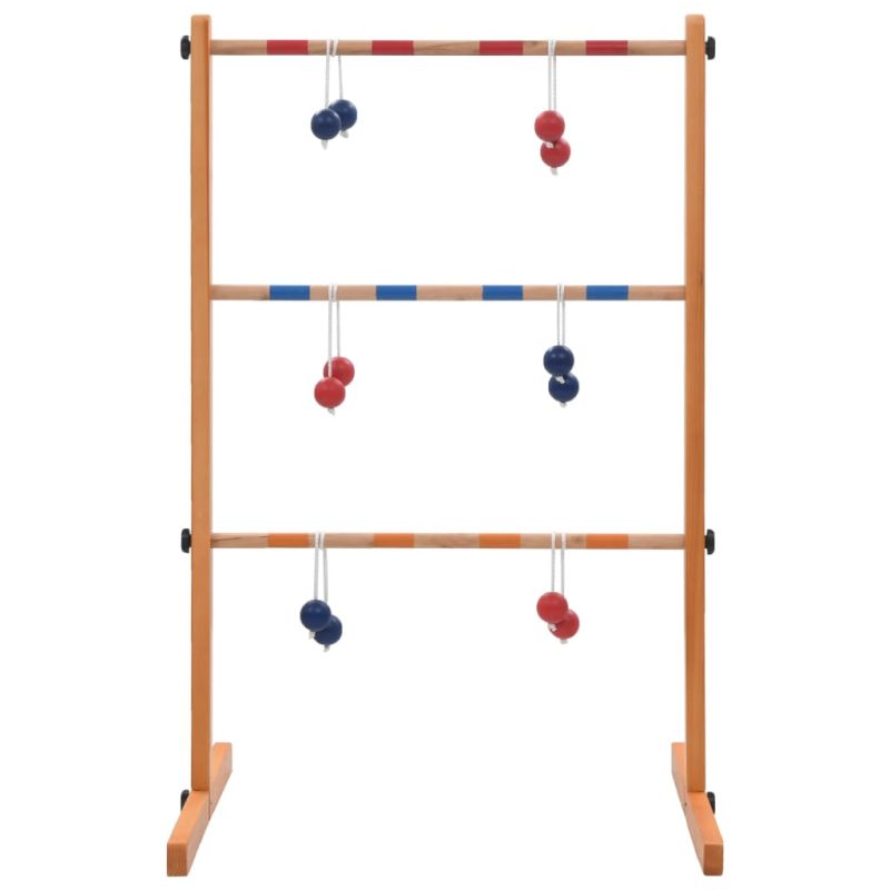 Хвърлете топката и се забавлявайте със семейството и приятелите си! Стълбата за игра с хвърляне на топки е популярна по целия свят! Просто дръжте една от топките в ръката и хвърлете, захванете ги с превъртане около стъпалото и отбележете точка! Изработена от масивна борова дървесина, стълбата е изключително стабилна и издръжлива. Доставката включва стълба за игра, 6 чифта топки и чанта за носене.