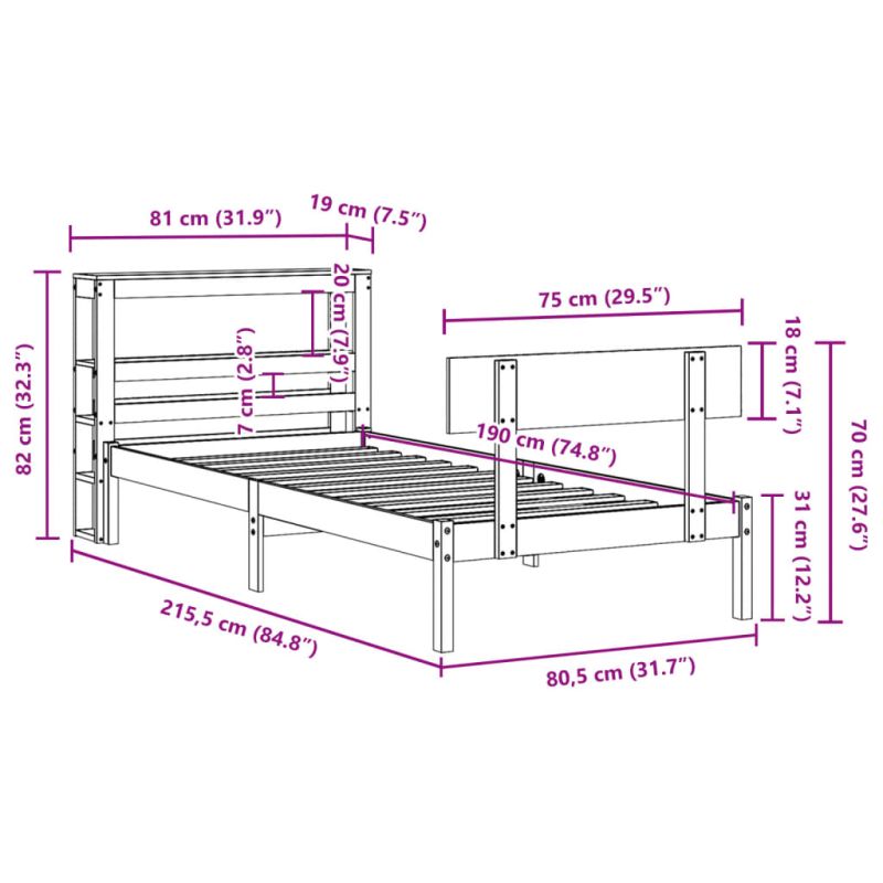 Рамка за легло без матрак, бял, 75x190 см, борово дърво масив