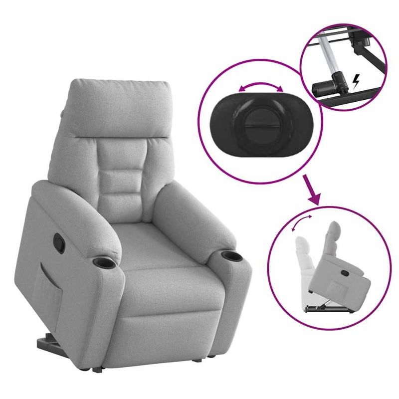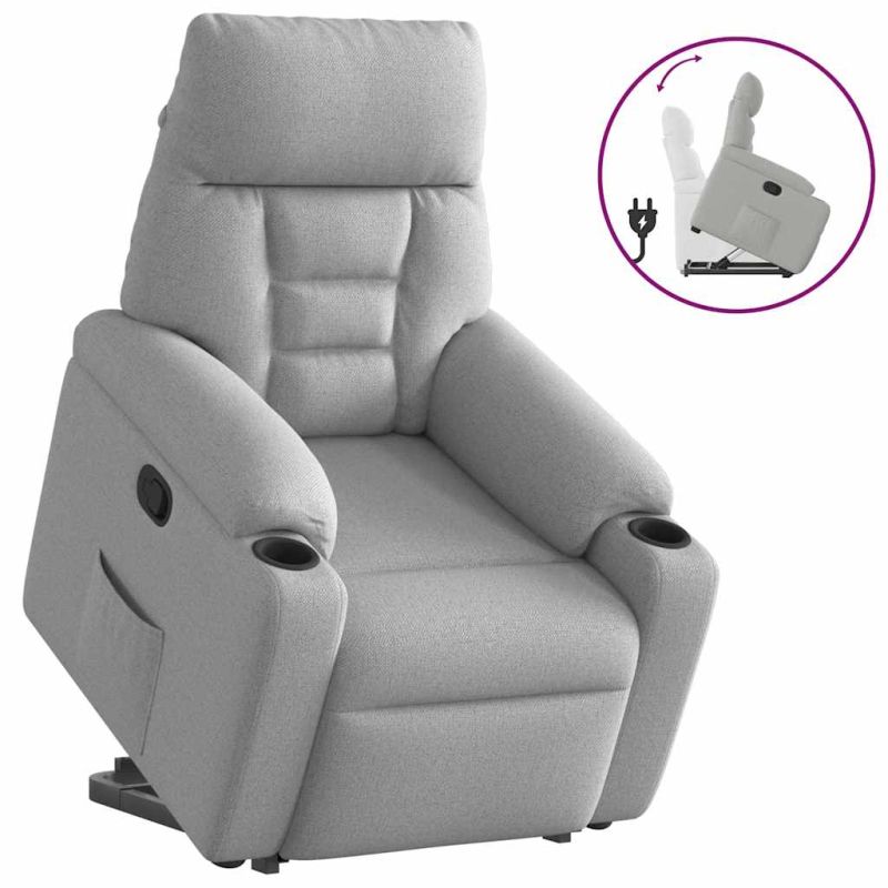 Облегнете се и се отпуснете в този изключително комфортен изправящ наклоняем стол! Функция за повдигане: Този стол реклайнер е оборудван с електрически двигател с функция за повдигане. Благодарение на функцията, която избутва целия стол нагоре, можете лесно да стоите, без да натоварвате гърба и коленете си с просто натискане на бутона.Функция за ръчно накланяне: Този накланящ се стол има дръжка от дясната страна. Можете ръчно да настроите поставката за крака и облегалката до произволна позиция според вашето удобство с просто издърпване на дръжката. Тази функция позволява максимален наклон от 135 градуса. Освен това облегалката може бързо да се върне на първоначалното си място с лесно издърпване на дръжката.Удобно седене: Дебело подплатената седалка, облегалка и широки подлакътници, покрити с текстил, осигуряват уютно и топло усещане, което ви кара да се чувствате като в прегръдка, докато седите. Тъканта се отличава със семпъл и изчистен вид и е дишаща и издръжлива.Здрава и стабилна рамка: Рамката, изработена от дърво и метал, осигурява здрава структура и стабилност. Този накланящ се фотьойл е удобен и издръжлив. Този уред може да се използва от деца над 8 години и лица с намалени физически, сензорни или ментални възможности или липса на опит и знания под надзор или ако са получили инструкции относно употребата на уреда по безопасен начин и разбират възможните опасности. Децата не трябва да си играят с уреда. Почистването и потребителската поддръжка не трябва да се извършват от деца без надзор. Захранването трябва да бъде само с безопасно изключително ниско напрежение, съответстващо на маркировката върху уреда. Включете USB конектора на уреда в USB гнездото на захранването. Моля, обърнете внимание да се използва само сертифицирано захранване DC 5V. По-високото напрежение може да доведе до прегряване и до повреда на устройството, както и до потенциален риск от пожар.