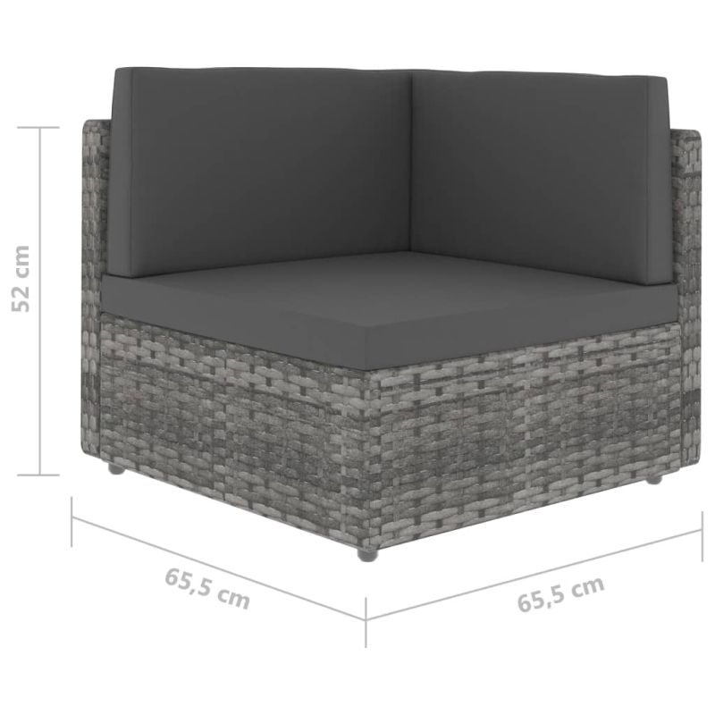 Този полиратанов модулен ъглов фотьойл съчетава стил и функционалност и е предназначен за целогодишно ползване на открито. Благодарение на устойчивия на атмосферни влияния РЕ ратан, този ъглов фотьойл е лесен за почистване, издръжлив и подходящ за ежедневна употреба. Седалката се отличава със здрава стоманена рамка с прахово покритие, която я прави изключително издръжлива. Той също така е лек и модулен, което го прави напълно функционален и лесен за преместване, за да се впише към всеки екстериор. Дебелите, подвижни възглавници са изключително комфортни. Можете да го комбинирате с други модулни сегменти, които са налични в падащото меню, за да създадете ваши собствени конфигурации на градинска мека мебел! Можете да намерите подобни примери в последните 9 снимки. Забележка: Препоръчваме покриването на дивана по време на дъжд, сняг или скреж.