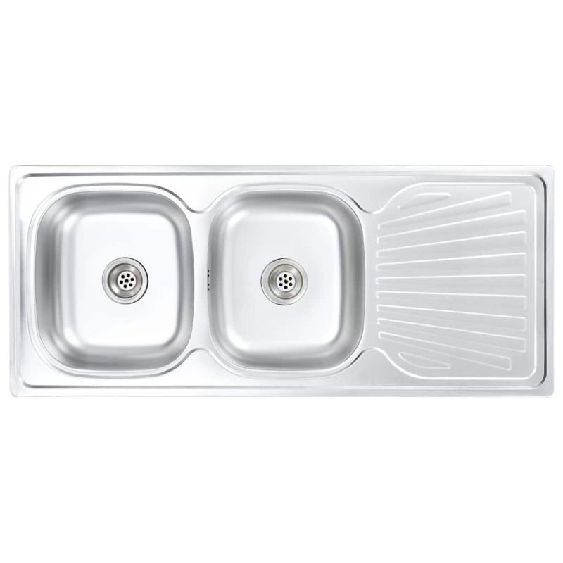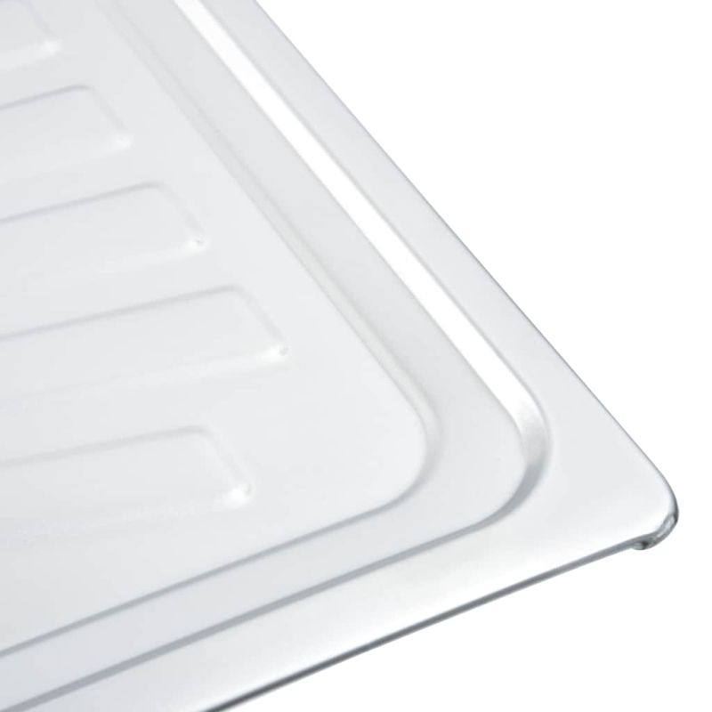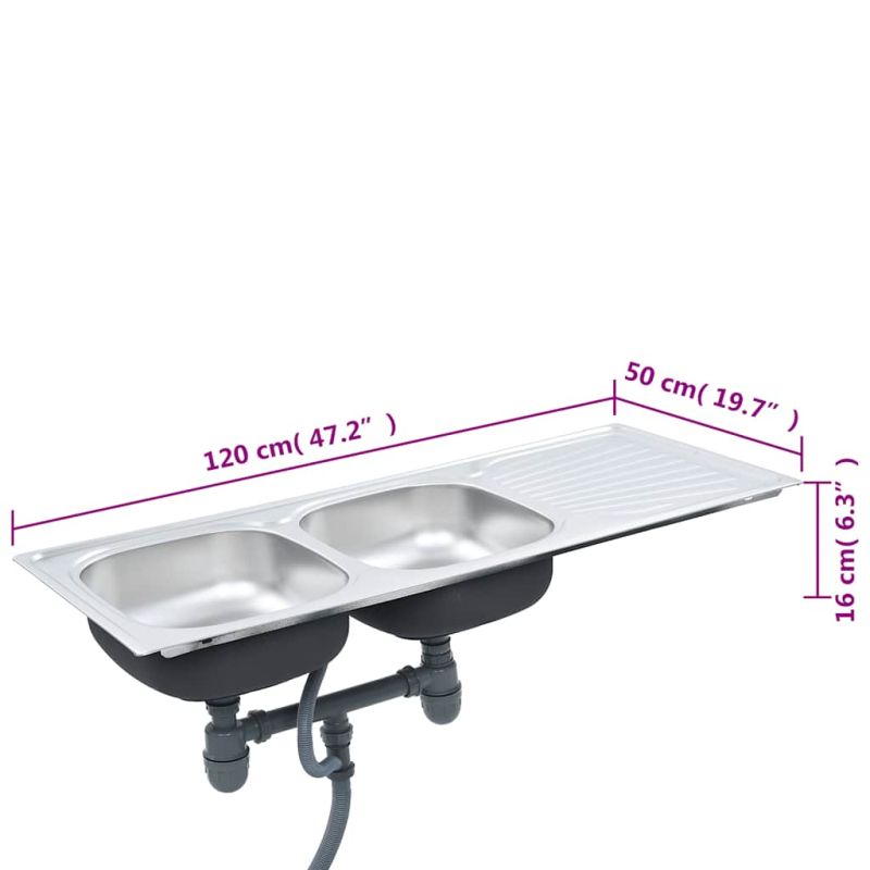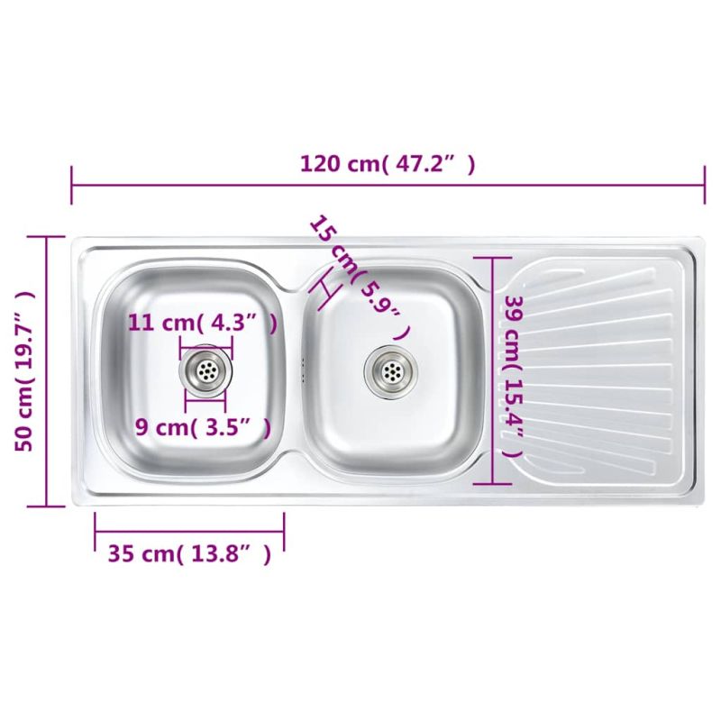 Тази качествена кухненска мивка разполага с две големи корита с широк отцедник отстрани. Доставя се с включена цедка и сифон и ще бъде чудесен избор за вашата кухня. Изработена от качествена неръждаема стомана, тази кухненска мивка е устойчива на драскотини и удари и е много издръжлива. Освен това тя отблъсква мръсотията и петната, което я прави лесна за почистване. Тази кухненска мивка пести място, с което ще ви остави по-голямо пространство за кухненски плот. Изключително дълбоките корита предоставят достатъчно място за големи тигани и чинии, а фактът, че са две създава изцяло отделена зона, която можете да използвате. Отцедникът ще ви бъде много удобен не само при миене на съдовете на ръка, но и като допълнително място за рязане на зеленчуци. Правоъгълната мивка може да бъде сглобена с поставен отцедник отляво или отдясно. Доставката включва също цедка и сифон. Децата трябва да бъдат наблюдавани, за да се гарантира, че не играят с уреда. Пазете децата далеч от зоната за сглобяване. Внимание: Прочетете внимателно инструкциите преди употреба и ги запазете за по-нататъшни справки.