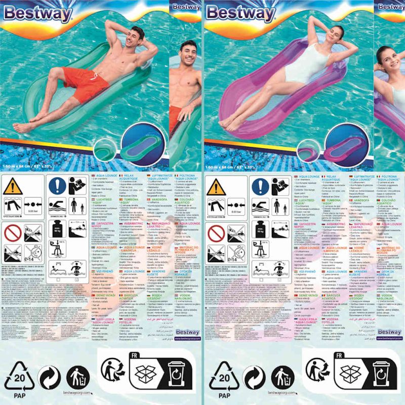 Разтоварете се във водата в горещ летен ден с този Aqua Lounge от Bestway! Той се отличава с удобна облегалка за глава и мрежесто дъно. Издръжливо и стабилно: Това водно легло е изработено от висококачествен винил, което го прави много издръжливо и здраво, за да ви държи на повърхността.Комфортен дизайн: То има 2 камери и удобна облегалка за глава.Лесна употреба: Този надуваем шезлонг може да се надува и изпуска бързо. Насладете се на върховен релакс и комфорт с този надуваем дюшек за басейн! Добре е да се знае:Този артикул се предлага в два цвята (син и лилав). Доставката е на случаен принцип, което гарантира ексклузивността и индивидуалността на вашия продукт. GPSR