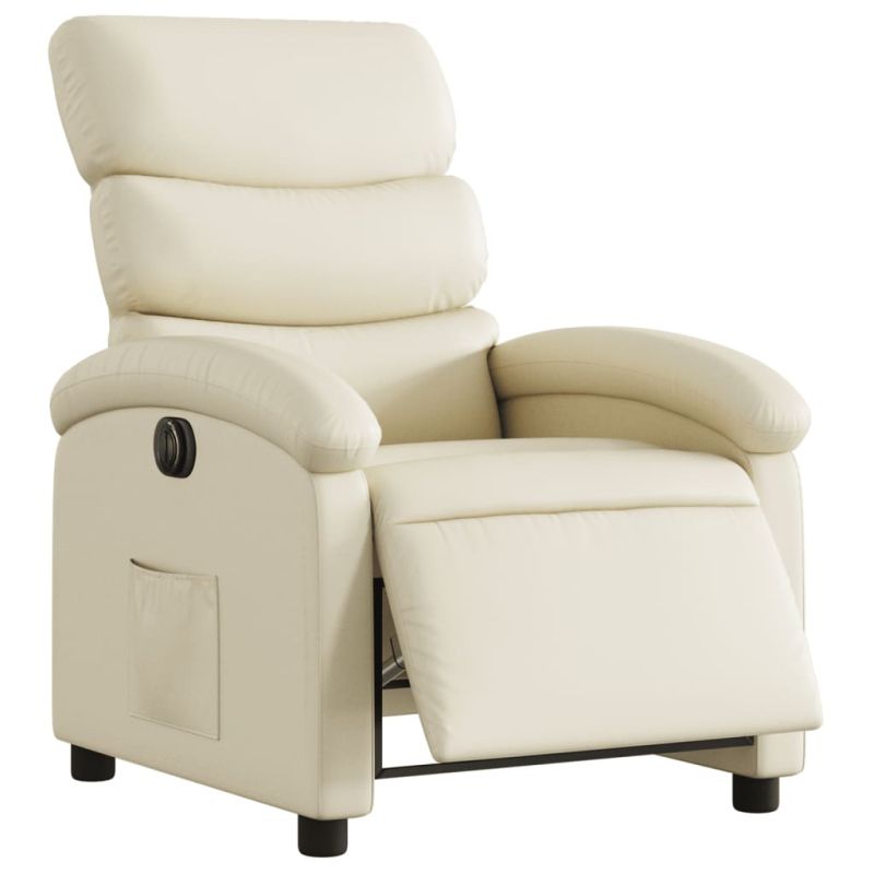 Облегнете се и се отпуснете в този изключително комфортен електрически наклоняем стол! Електрическа функция за накланяне: Този стол с облегалка е оборудван с електрически мотор, който помага автоматично да регулирате поставката за крака и облегалката до произволна позиция според вашето удобство с просто натискане на бутона отстрани на стола. Тази функция позволява максимален наклон от 135 градуса. Освен това облегалката може да се върне автоматично на първоначалното си място с лесно натискане на бутона.Удобно седене: Дебело подплатената седалка, облегалката и широките подлакътници, покрити с изкуствена кожа, осигуряват уютно усещане, което ви кара да се чувствате като в прегръдка, докато седите. Изкуствената кожа е много издръжлив материал. Устойчива е на петна, което я прави лесна за почистване с влажна кърпа. Гладката повърхност също така придава луксозен вид и красотата на естествената кожа.Удобен страничен джоб: Този фотьойл има страничен джоб, за да държите основните си вещи леснодостъпни.Здрава и стабилна рамка: Рамката, изработена от дърво и метал, осигурява здрава структура и стабилност. Този накланящ се фотьойл е удобен и издръжлив. Максимално 110 кг на седалка.Този уред може да се използва от деца на възраст от 8 години и повече и от лица с намалени физически, сетивни или умствени способности или с липса на опит и познания, ако са получили надзор или инструкции за безопасно използване на уреда и разбират свързаните с него опасности. Децата не трябва да си играят с уреда. Децата не трябва да почистват и да извършват потребителска поддръжка без надзор.
