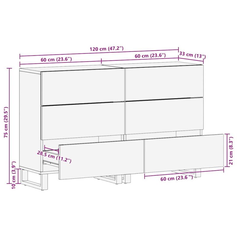 Този комплект реновирани шкафове е стилен елемент за вашия дом, идеален за трапезарията и всекидневната. С размери 60 x 33,5 x 75 см, той предлага достатъчно място за съхранение, докато внася реновиран чар в интериора. Изработен е от масивна мангова дървесина, а отзад е подсилен с инженерна дървесина, което му придава здравина и естествена красота – идеален за уютно и привлекателно пространство. Правоъгълната форма му позволява да се вписва в различни стилове на декорация и е страхотен избор за любителите на елегантния дизайн. Издръжлива конструкция Изработен е от здраво мангово дърво, което обещава дълготрайност и стил. Характерната текстура на манговата дървесина добавя реновиран чар на всяко помещение. Инженерната дървесина отзад подсилва шкафа, предоставяйки допълнителна опора за вашите вещи. Функционален дизайн Планиран с акцент на полезността, шкафът предлага много решения за съхранение. Просторните му отделения са подходящи за всякакви домашни пособия, от съдове до спално бельо – идеален за трапезарии, всекидневни или други места, където е нужно съхранение, оставайки в същото време организиран. Удобни функции Оборудван е с дръжки тип чашки, които осигуряват лесен достъп до чекмеджетата. Големите дръжки позволяват на пръстите ви да отварят лесно всяко намаление, повишавайки удобството. Универсално приложение Благодарение на реновирания си вид и удобния размер, шкафът лесно се вписва в различни интериорни стилове, независимо дали е в трапезария или всекидневна. Дизайнът му е вечен и лесно допълва разнообразни теми в декорацията, осигурявайки възможности за креативна стилизация. Лесна поддръжка Поддържането на този шкаф е лесно. Просто го избършете с влажна кърпа, за да отстраните прахта и да запазите блясъка. Следвайки тези лесни стъпки, вие осигурявате, че шкафът остава красив години напред.