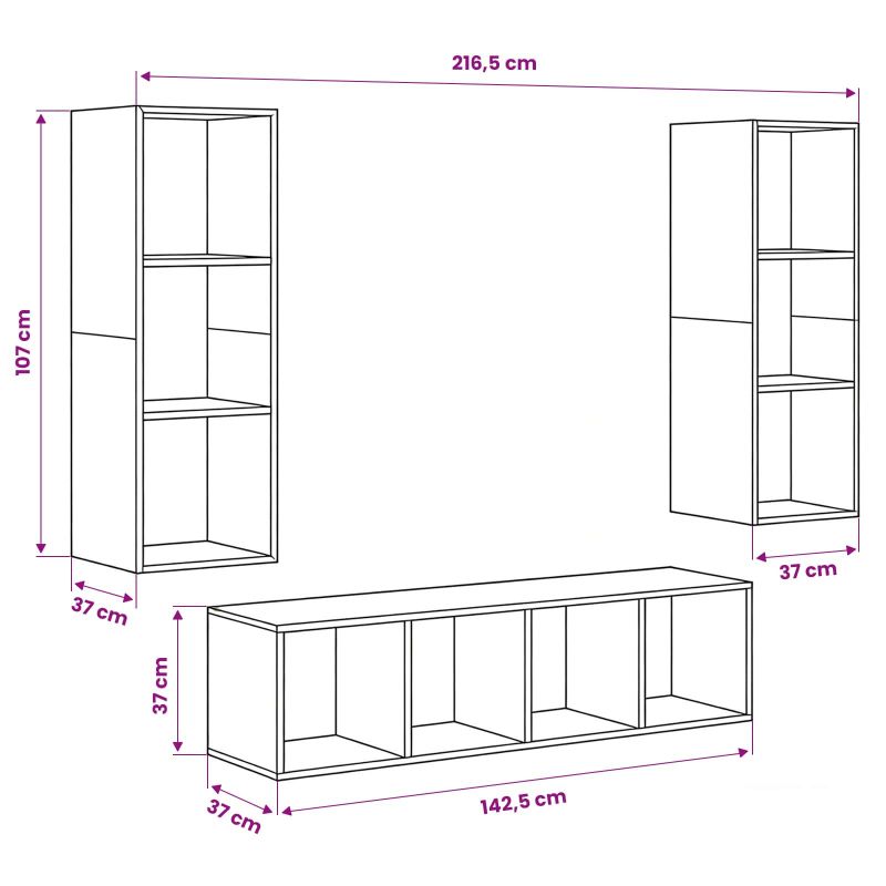 Стенният телевизионен шкаф е стилно решение за организиране на съхранение в модерен хол. С прост и минималистичен дизайн, този комплект шкафове предлага точното пространство за вашите медийни аксесоари и други неща, създавайки спокойна атмосфера. Когато го монтирате на стената, спестявате място на пода и придавате спретнат вид. Най-добре се вписва в съвременни интериори, правейки зоната около телевизора акцент. Завършен в неутрални цветове, идеално допълва всякакви стилове. Можете да го покажете с домашни растения или нежни осветени декорации. Потребителите ще оценят както функционалността, така и визуалния стил, което прави атмосферата приятна за всички. Материали: Направен от качествена инженерна дървесина, този стенен телевизионен шкаф е здрав и издръжлив. Тя е избрана заради устойчивостта й на ежедневно износване и предлага стабилни цветове и текстури. Този материал показва сила, гарантирайки дългосрочно надеждно съхранение на различно оборудване или вещи. Включени компоненти: В комплекта има два по-малки шкафа (37 x 37 x 72 см) и един по-голям (37 x 37 x 142.5 см). Всеки шкаф е изграден с рафтове, които поддържат различни изисквания за съхранение. Компонентите акцентират на функционалността и предоставят чудесна организация. Характеристики / Функция / Дизайн: Проектиран според съвременния вкус, комплектът съчетава елегантност с практичност. Монтирането на стената е удобно, позволявайки чиста и просторна обстановка. Препоръчителни употреби: Идеален е за всекидневни или медийни зони, предлага гъвкавост и полезност за всякакви ситуации. Проектиран е да побира различни медийни устройства, като същевременно създава изискан стил. Грижа & Поддръжка: За да запазите издръжливостта и вида му, е важно да следвате инструкциите за сглобяване. Обикновеното почистване и защитните покрития при контакт с прах или UV светлина ще поддържат мебелите ви. Това осигурява дълговечен и естетичен вид, защитаяки инвестицията ви.