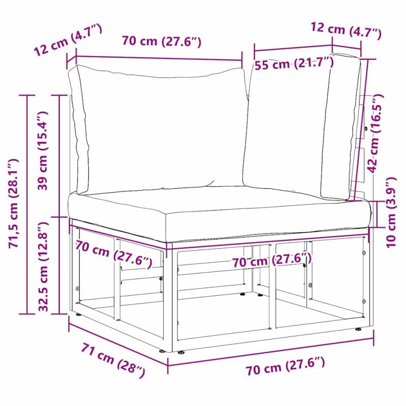 Този модерен комплект градински мебели предлага изчистен и опростен дизайн, който безпроблемно се интегрира във всяко открито пространство. Създаден за тези с чувствителност към съвременния стил, всяка част притежава чисти линии и минималистичен вид. Мебелите могат да повишат нивото на вашата градина, тераса или балкон, създавайки приветлива обстановка за събирания или спокойни уединения. Устойчиви на времето рамки Изработени от алуминий, тези мебели са перфектни за издръжливост на елементите. Алуминиевата конструкция осигурява комплектът да остане лек, но здрав, предлагащ дълготрайна употреба на открито, без компромиси в устойчивостта. Прахово боядисано покритие Прахово боядисаната повърхност осигурява допълнителен слой защита, удължавайки живота на вашите мебели. Този защитен слой предпазва от износване и запазва гладкия и полиран вид с времето. Модерен дизайн Комплектът разполага с ясно изразен модерен естетически вид, който допълва различни открити декори. С простия, но функционален дизайн, е идеален за създаване на модерен оазис в градината или на терасата, предлагайки стил и комфорт. Изключителен комфорт Проектиран с мисъл за потребителския комфорт, този комплект предоставя приветливо пространство за релаксация или забавления. Неговият просторно разположение предлага достатъчно места за сядане и гъвкавост за открито, което го прави перфектно допълнение за всяко открито пространство. Лесно поддържане За да осигурите дълготрайността на вашите градински мебели, просто ги покривайте, когато не са в употреба. Тази лесна стъпка помага да запазите изключителното им състояние, добавяйки удобство към вашето открито пространство. Минималната поддръжка осигурява мебелите да останат толкова привлекателни, колкото деня, в който бяха закупени.