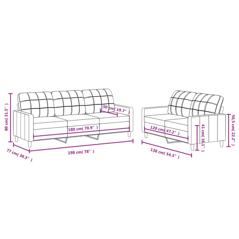 Този комплект дивани е отлично място за вашето време за разговори, четене, гледане на телевизия или просто почивка. Той е предназначен да бъде фокусна точка във вашия дом. Издръжлив текстил: Материята се отличава със семпъл и изчистен вид, като същевременно остава дишаща и дълготрайна.Здрава и стабилна рамка: Шперплатът и металната рамка на седалката на дивана осигуряват здравина и стабилност.Удобна седалка: Диванът е много удобен с дебело подплатената седалка, подлакътниците и възглавницата за гърба.Атрактивен дизайн: Отличаваща се със семпъл, но модерен дизайн, тази мека мебел за всекидневна е предназначена да привлича вниманието във вашата стая. Максимално 110 кг на седалка. Съобразете се с риска от открит огън и други източници на силна топлина в близост до продукта.