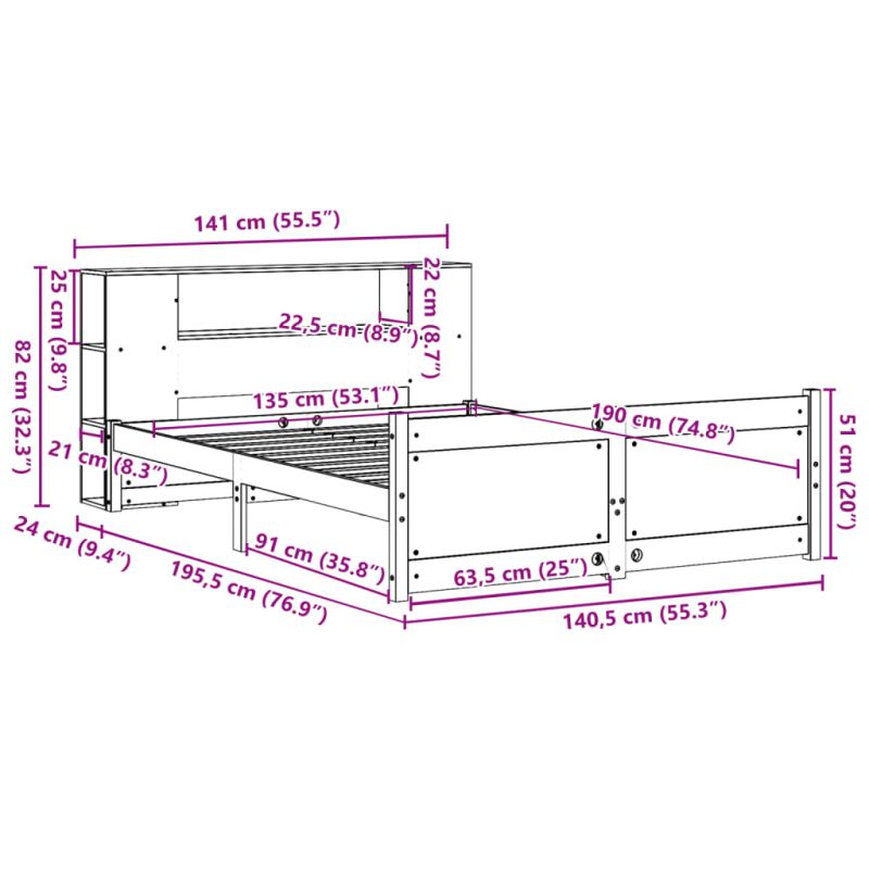 Легло с етажерка за книги, без матрак, 135x190 см, бор масив