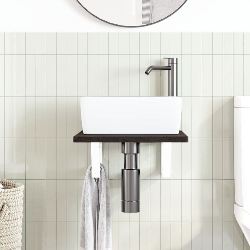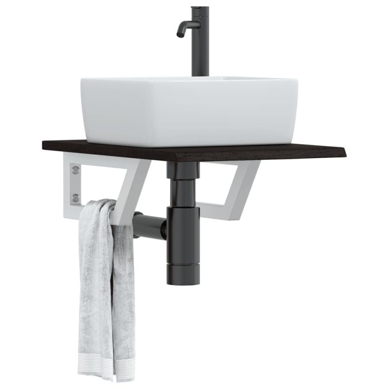 Стенният рафт за мивка се прикрепя сигурно към стената, осигурявайки елегантно и спестяващо място решение за вашата баня. Здрав и дълготраен: Този рафт за мивка е комбиниран със стоманена конструкция и плот от масивна дъбова дървесина, което го прави здрав, стабилен и дълготраен.Спестяване на място: Плаващият рафт за мивка има достатъчно място за съхранение на кремове и дребни предмети. Благодарение на трапецовидната форма можете да закачите кърпи или други неща на опората, за да спестите място.Лесен за използване: Плотът се доставя без дупки, за да позволи на мивката да се монтира отляво, отдясно или в центъра, в зависимост от изискванията на вашето помещение. Благодарение на предварително пробитите отвори в държача, той може лесно да се сглоби с плота и да се монтира на стената.Широки приложения: Благодарение на модерния си дизайн, осигурява допълнително пространство за различни видове бани. Добре е да се знае:Винтовете не са включени, можете да закупите винтовете отделно въз основа на информацията, предоставена по-долу.Прикрепване към стена: 2 бр дюбели M8 на скобаДървен плот: 2 бр M5x18 винта (T=2) или 2 бр M5x20 винта (T=2,5/4 см) на скобаКато естествен продукт, дървото може да има възли и несъвършенства, които ние запълваме с черни пълнежи, за да осигурим гладък външен вид.