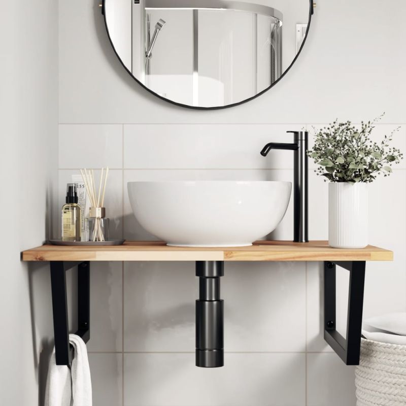 Стенният рафт за мивка се прикрепя сигурно към стената, осигурявайки елегантно и спестяващо място решение за вашата баня. Здрав и дълготраен: Този рафт за мивка е комбиниран със стоманена конструкция и плот от масивна акациева дървесина, което го прави здрав, стабилен и дълготраен.Спестяване на място: Плаващият рафт за мивка има достатъчно място за съхранение на кремове и дребни предмети. Благодарение на трапецовидната форма можете да закачите кърпи или други неща на опората, за да спестите място.Лесен за използване: Плотът се доставя без дупки, за да позволи на мивката да се монтира отляво, отдясно или в центъра, в зависимост от изискванията на вашето помещение. Благодарение на предварително пробитите отвори в държача, той може лесно да се сглоби с плота и да се монтира на стената.Широки приложения: Благодарение на модерния си дизайн, осигурява допълнително пространство за различни видове бани. Добре е да се знае:Винтовете не са включени, можете да закупите винтовете отделно въз основа на информацията, предоставена по-долу.Прикрепване към стена: 2 бр дюбели M8 на скобаДървен плот: 2 бр M5x18 винта (T=2) или 2 бр M5x20 винта (T=2,5/4 см) на скоба
