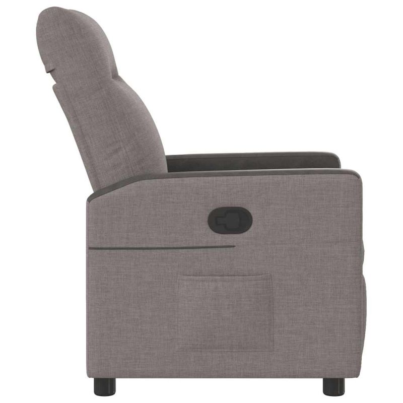 Облегнете се и се отпуснете в този изключително комфортен наклоняем стол! Функция за ръчно накланяне: Този накланящ се стол има дръжка от дясната страна. Можете ръчно да настроите поставката за крака и облегалката до произволна позиция според вашето удобство с просто издърпване на дръжката. Тази функция позволява максимален наклон от 135 градуса. Освен това облегалката може бързо да се върне на първоначалното си място с лесно издърпване на дръжката.Удобно седене: Дебело подплатената седалка, облегалката и широките подлакътници, покрити с текстил, осигуряват уютно и топло усещане, което ви кара да се чувствате като в прегръдка, докато седите. Тъканта се отличава със семпъл и изчистен вид и е дишаща и издръжлива.Удобен страничен джоб: Този фотьойл има страничен джоб за вашето дистанционно управление или за поддържане на вашите основни вещи леснодостъпни.Здрава и стабилна рамка: Рамката, изработена от дърво и метал, осигурява здрава структура и стабилност. Този накланящ се фотьойл е удобен и издръжлив.
