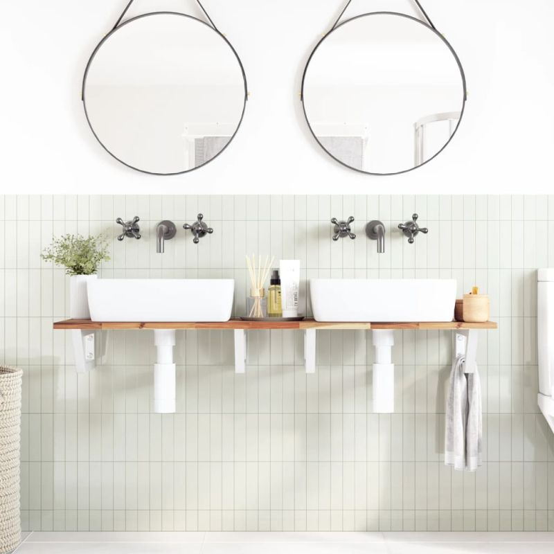 Стенният рафт за мивка се прикрепя сигурно към стената, осигурявайки елегантно и спестяващо място решение за вашата баня. Здрав и дълготраен: Този рафт за мивка е комбиниран със стоманена конструкция и плот от масивна акациева дървесина, което го прави здрав, стабилен и дълготраен.Спестяване на място: Плаващият рафт за мивка има достатъчно място за съхранение на кремове и дребни предмети. Благодарение на трапецовидната форма можете да закачите кърпи или други неща на опората, за да спестите място.Лесен за използване: Плотът се доставя без дупки, за да позволи на мивката да се монтира отляво, отдясно или в центъра, в зависимост от изискванията на вашето помещение. Благодарение на предварително пробитите отвори в държача, той може лесно да се сглоби с плота и да се монтира на стената.Широки приложения: Благодарение на модерния си дизайн, осигурява допълнително пространство за различни видове бани. Добре е да се знае:Винтовете не са включени, можете да закупите винтовете отделно въз основа на информацията, предоставена по-долу.Прикрепване към стена: 2 бр дюбели M8 на скобаДървен плот: 2 бр M5x18 винта (T=2) или 2 бр M5x20 винта (T=2,5/4 см) на скоба