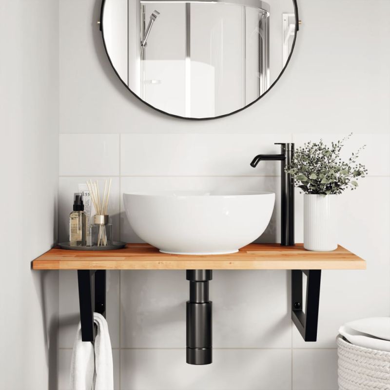 Стенният рафт за мивка се прикрепя сигурно към стената, осигурявайки елегантно и спестяващо място решение за вашата баня. Здрав и дълготраен: Този рафт за мивка е комбиниран със стоманена конструкция и плот от масивна акациева дървесина, което го прави здрав, стабилен и дълготраен.Спестяване на място: Плаващият рафт за мивка има достатъчно място за съхранение на кремове и дребни предмети. Благодарение на трапецовидната форма можете да закачите кърпи или други неща на опората, за да спестите място.Лесен за използване: Плотът се доставя без дупки, за да позволи на мивката да се монтира отляво, отдясно или в центъра, в зависимост от изискванията на вашето помещение. Благодарение на предварително пробитите отвори в държача, той може лесно да се сглоби с плота и да се монтира на стената.Широки приложения: Благодарение на модерния си дизайн, осигурява допълнително пространство за различни видове бани. Добре е да се знае:Винтовете не са включени, можете да закупите винтовете отделно въз основа на информацията, предоставена по-долу.Прикрепване към стена: 2 бр дюбели M8 на скобаДървен плот: 2 бр M5x18 винта (T=2) или 2 бр M5x20 винта (T=2,5/4 см) на скоба