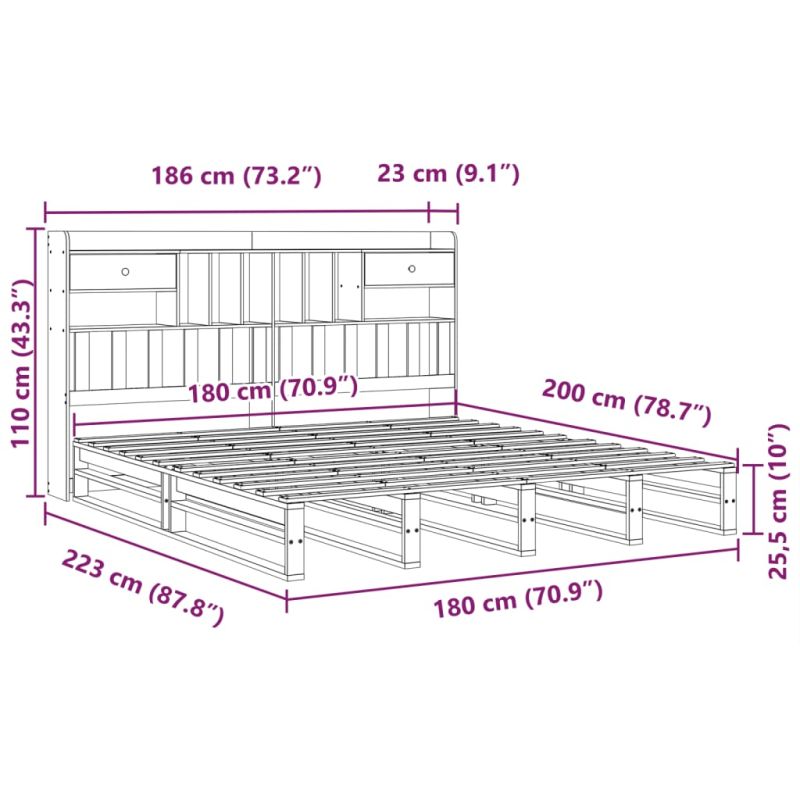 Легло с етажерка за книги, без матрак, 180x200 см, бор масив