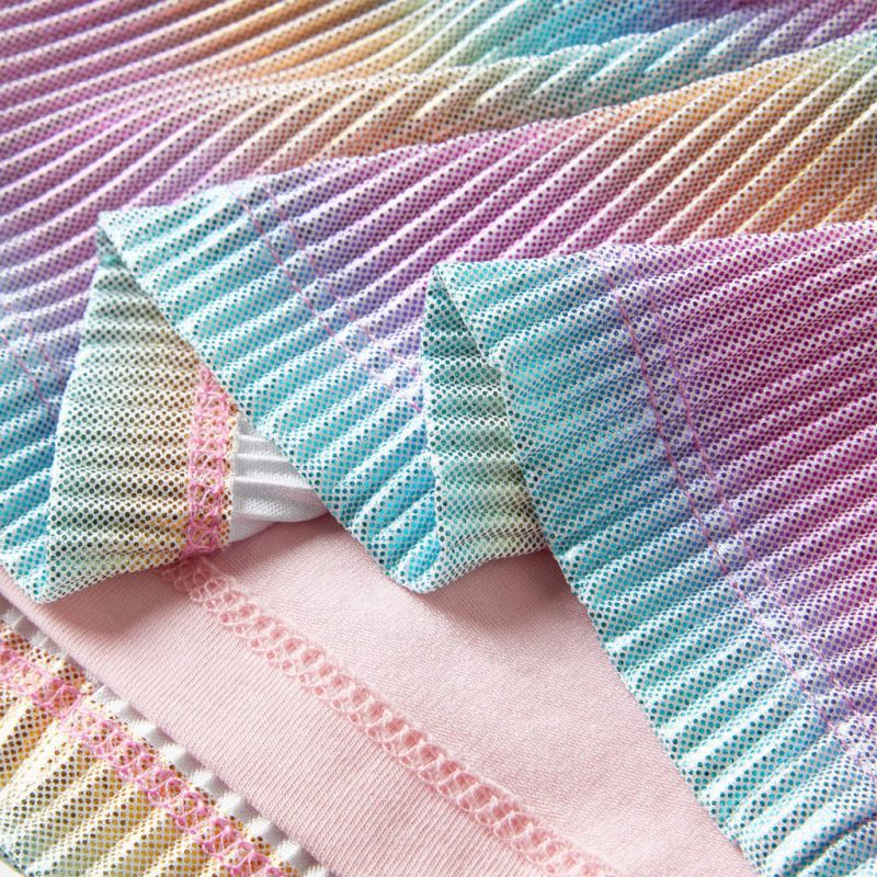 Нашата линия за детски дрехи е за достъпни, висококачествени и издръжливи ежедневни облекла за деца на възраст от 1,5 до 10 години. Нашата гама включва якета, пуловери, ризи и много други, с разнообразие от стилове, размери и цветове. Следвайки стандарта за високо качество на пазара, ние използваме висококачествени материали и усъвършенствани производствени техники. Тази детска пола има широк ластик на талията в блестящо розово и клоширана линия. Детската пола се предлага в цветове на дъгата за нотка детско забавление! Детската къса пола е изработена от мек материал, включващ памук, еластан и полиестер за комфорт и дишане. Добре е да знаете: Таблицата с размери на снимката предоставя размери за деца на възраст от 1,5 до 10 години, като обхваща височината, гърдите, талията и ханша. Лесно можете да откриете подходящия за вашето дете.