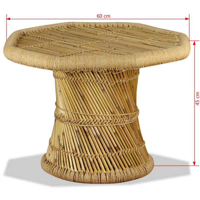 Тази красива масичка за кафе ще бъде чудесно допълнение към всеки домашен декор. Може да се използва и като странична маса, крайна маса, стойка за телефон или стойка за растения, холна маса, маса за диван и др. Тази холна маса е ръчно изработена от естествен бамбук и юта, което я прави здрава и издръжлива. Нейният осмоъгълен плот е идеален за поставяне на книги, лаптоп, саксии и др. Освен това се избърсва лесно. Автентичният цвят на бамбук и юта ще придаде на вашия декор нотка естествен чар.
