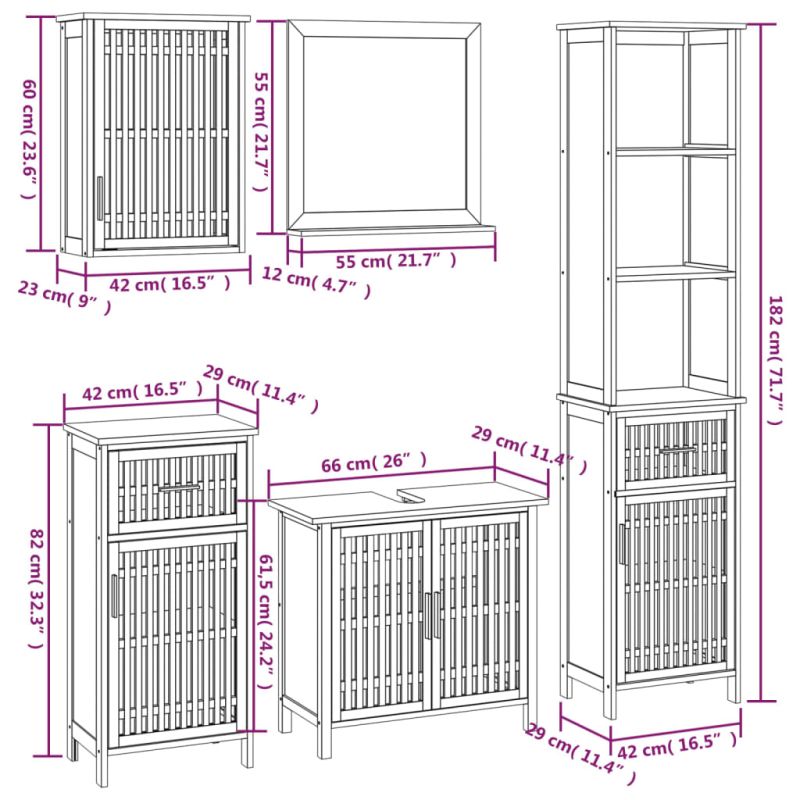 Внесете полъх на елегантен чар в декора на вашата баня с този комплект мебели за баня! Орехово дърво масив: Масивната орехова дървесина е плътна и здрава, което я прави много устойчива на износване. При това е добре известна със своя специфичен цвят и атрактивни шарки.Достатъчно място за съхранение: Комплектът за съхранение за баня разполага с достатъчно място за съхранение, където да държите вашите принадлежности за баня добре организирани.Страхотна вентилация: Вратата и чекмеджето на шкафовете за баня са проектирани с решетъчен дизайн, който гарантира оптимална вентилация.Ясно отражение: Огледалото осигурява ясно отражение на лицето. Така можете да се насладите на красиво и естествено отражение, когато стоите пред него.Практичен дизайн: Горната част на този шкаф за мивка е идеална за поставяне на мивката. Внимание:За предотвратяване на преобръщане този продукт трябва да се използва с предоставения анкер за стена. Добре е да се знае:За да бъде сглобяването възможно най-лесно, всеки продукт се доставя с ръководство.Винтовете и дюбелите за вътрешната стена не са включени. Съветваме ви да намерите и използвате винтове и дюбели, подходящи специално за вашите стени. Ако не сте сигурни, можете да се консултирате с професионалист. Моля, прочетете и следвайте всяка стъпка от инструкциите.