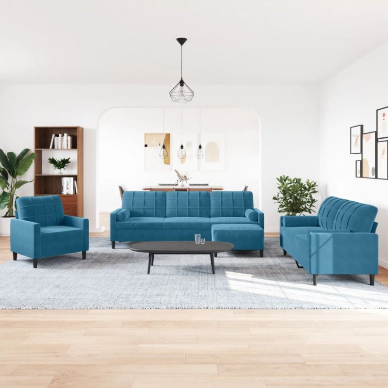 Мека мебел от 4 части с възглавници и болстери син кадифе