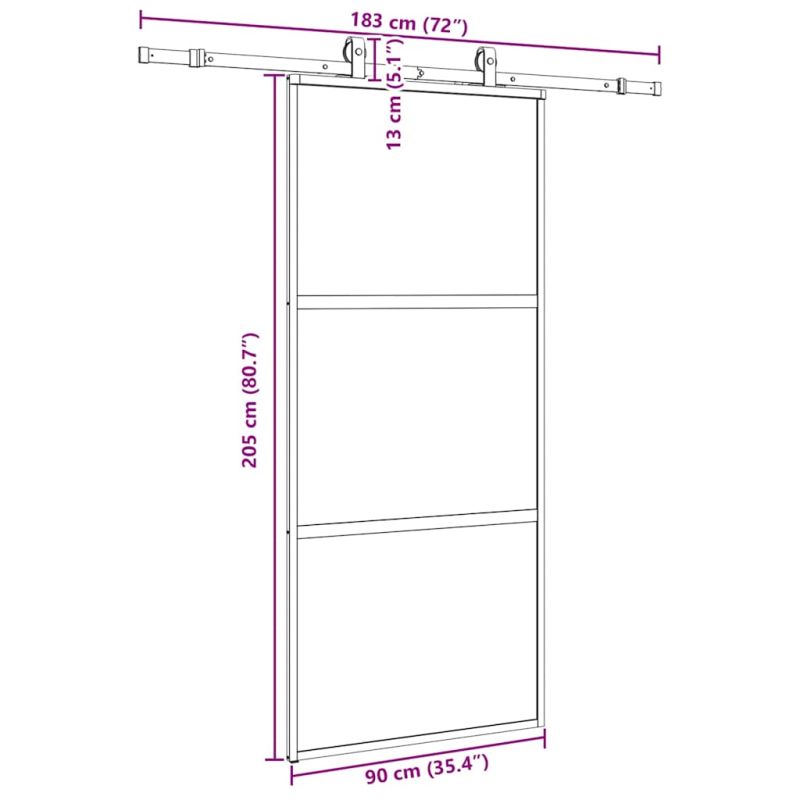 Създайте стилен преход от една стая към друга с тази плъзгаща се врата! Издръжлив материал: Благодарение на интелигентната си структура закаленото стъкло е по-здраво и издръжливо от всяко друго стъкло. Закаленото стъкло е известно с това, че издържа на силни удари, надрасквания, удари и др.Стабилна и дълготрайна рамка: Алуминият е едновременно лек и издръжлив, с отлична устойчивост на корозия благодарение на самозащитния си оксиден слой. Тази алуминиева врата е проектирана за дълготрайност, което я прави идеален избор за всеки, който търси стабилна врата.Безопасен и безшумен: Благодарение на стопера, който спира вратата при отваряне или затваряне чрез задействане на стоп буферите, плъзгащата се врата може да се отваря и затваря безшумно.Дизайн за поверителност: Матираното стъкло пропуска част от светлината, за да създаде светла жилищна площ и едновременно с това неприкосновеност на личния живот.Спестяващ място дизайн: Тази плъзгаща се врата спестява място и прави стаята по-просторна. Тя е първият избор за семпъл и атмосферичен интериорен дизайн в модерен стил.Лесен за използване: В обхвата на доставката е включен и комплект обков за плъзгащи се врати, така че монтажът е безпроблемен. Комплектът обков е изработен от прахово боядисана стомана и по този начин допринася за здравината на вратата. Добре е да се знае:За монтажа можете да се консултирате с нашето ръководство за монтаж на комплектите за врати и плъзгащи се врати.