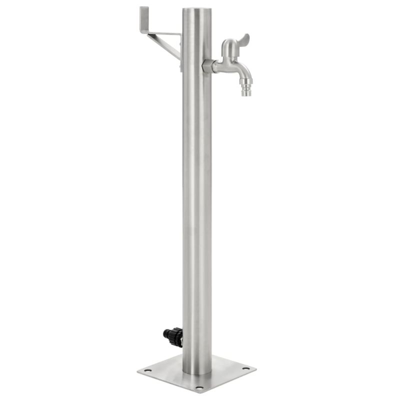 Тази свободностояща градинска чешма с кранче е чудесно допълнение към вашата градина. Независимо дали се използва за поливане на цветя или за измиване на ръцете, винаги ще разполагате с прясна вода навън с тази чешма от неръждаема стомана. Маркучите за вода могат да бъдат прикрепени към долния конектор, за да тръгне водата. Две тефлонови ролки са включени за уплътняване против теч на вода. Градинската чешма се сглобява лесно с осигурените монтажни аксесоари. Моля, имайте предвид, че можете да намерите съвместим анкер за земя в нашия уеб магазин (SKU 45459), който може да се използва за фиксиране на колоната в земята.