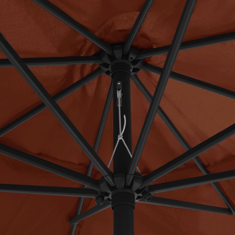 Този практичен градински чадър е перфектен за създаване на сянка, което го прави необходимост, когато се наслаждавате на времето си на открито. Изработено от неизбледняващ полиестер, покривалото на чадъра се почиства лесно. Солидният метален прът и 8-те здрави спици правят чадъра много стабилен и устойчив. Нашият градински чадър се отваря и затваря удобно, благодарение на манивелата. Артикулът се сглобява лесно. Моля, забележете, че препоръчваме обработката на текстила на чадъра с хидроизолационен спрей, ако е подложен на силни валежи.
